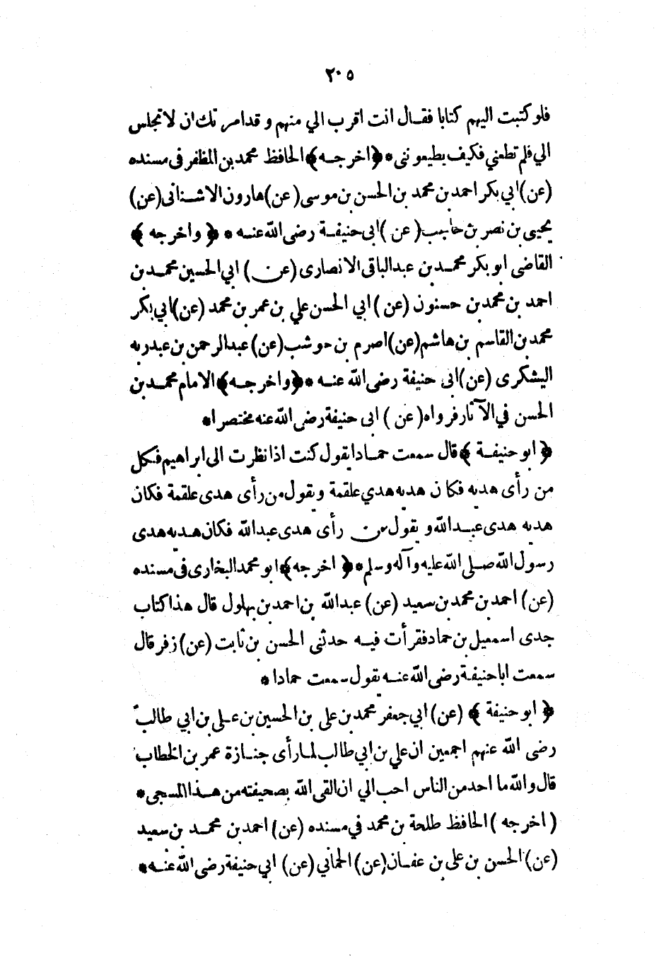 (أبو حنيفة) قال سمعت حماداً يقول كنت إذا نظرت إلى إبراهيم فكل من رأى هديه فكان هديه هدي علقمة ويقول من رأى هدي علقمة فكان هديه هدي عبد الله ويقول من رأى هدي عبد الله فكان هديه هدي رسول الله صلى الله عليه وآله وسلم* (أخرجه) أبو محمد البخاري في مسنده (عن) أحمد بن محمد بن سعيد (عن) عبد الله بن أحمد بن بهلول قال هذا كتاب جدي إسماعيل بن حماد فقرأت فيه حدثني الحسن بن ثابت (عن) زفر قال سمعت أبا حنيفة رضي الله عنه يقول سمعت حماداً*