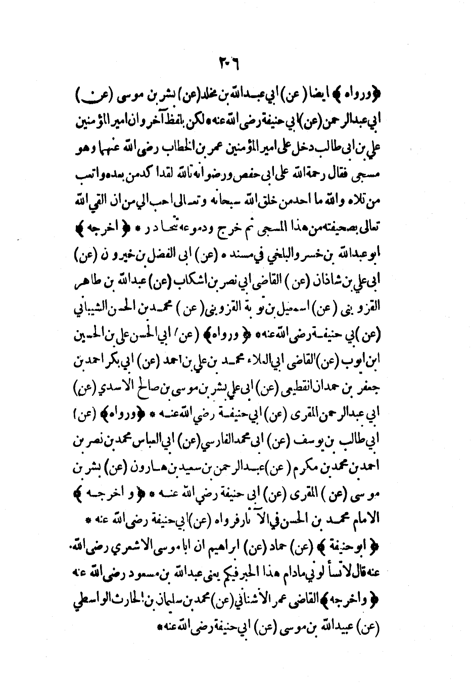 (ورواه) أيضاً (عن) أبي عبد الله بن مخلد (عن) بشر بن موسى (عن) أبي عبد الرحمن (عن) أبي حنيفة رضي الله عنه* لكن بلفظ آخر وأن أمير المؤمنين علي بن أبي طالب دخل على أمير المؤمنين عمر بن الخطاب رضي الله عنهما وهو مسجى فقال رحمة الله على أبي حفص ورضوانه تالله لقد أكد من بعده وأتعب من تلاه والله ما أحد من خلق الله سبحانه وتعالى أحب إلي من أن ألقى الله تعالى بصحيفته من هذا المسجى ثم خرج ودموعه تتحادر* (أخرجه) أبو عبد الله بن خسرو البلخي في مسنده (عن) أبي الفضل بن خيرون (عن) أبي علي بن شاذان (عن) القاضي أبي نصر بن اشكاب (عن) عبد الله بن طاهر القزويني (عن) إسماعيل بن توبة القزويني (عن) محمد بن الحسن الشيباني (عن) أبي حنيفة رضي الله عنه* (ورواه) (عن) أبي الحسن علي بن الحسين ابن أيوب (عن) القاضي أبي العلاء محمد بن علي بن أحمد (عن) أبي بكر أحمد بن جعفر بن حمدان القطيعي (عن) أبي علي بشر بن موسى بن صالح الأسدي (عن) أبي عبد الرحمن المقري (عن) أبي حنيفة رضي الله عنه* (ورواه) (عن) أبي طالب بن يوسف (عن) أبي محمد الفارسي (عن) أبي العباس محمد بن نصر بن أحمد بن محمد بن مكرم (عن) عبد الرحمن بن سعيد بن هارون (عن) بشر بن موسى (عن) المقري (عن) أبي حنيفة رضي الله عنه* (وأخرجه) الإمام محمد بن الحسن في الآثار فرواه (عن) أبي حنيفة رضي الله عنه*
