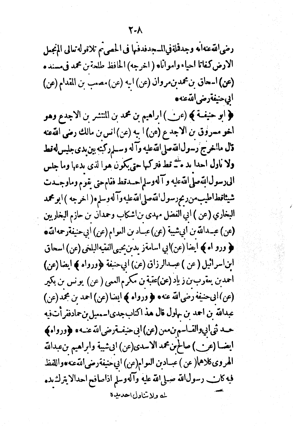 (أبو حنيفة) (عن) إبراهيم بن محمد بن المنتشر بن الأجدع وهو أخو مسروق بن الأجدع (عن) أبيه (عن) أنس بن مالك رضي الله عنه قال ما أخرج رسول الله صلى الله عليه وآله وسلم ركبته بين يدي جليس له قط ولا ناول أحداً يده قط فتركها حتى يكون هو الذي يدعها وما جلس إلى رسول الله صلى الله عليه وآله وسلم أحد قط فقام حتى يقوم وما وجدت شيئاً قط أطيب من ريح رسول الله صلى الله عليه وآله وسلم* (أخرجه) أبو محمد البخاري (عن) أبي الفضل مهدي بن اشكاب وحمدان بن حازم البخاريين (عن) عبد الله بن أبي شيبة (عن) عباد بن العوام (عن) أبي حنيفة رحمه الله* (ورواه) أيضاً (عن) أبي أسامة زيد بن يحيى الفقيه البلخي (عن) إسحاق ابن إسرائيل (عن) عبد الرزاق (عن) أبي حنيفة (ورواه) أيضاً (عن) أحمد بن يعقوب بن زياد (عن) عقبة بن مكرم العمي (عن) يونس بن بكير (عن) أبي حنيفة رضي الله عنه* (ورواه) أيضاً (عن) أحمد بن محمد (عن) عبد الله بن أحمد بن بهلول قال هذا كتاب جدي إسماعيل بن حماد فقرأت فيه حدثني أبي والقاسم بن معن (عن) أبي حنيفة رضي الله عنه* (ورواه) أيضاً (عن) صالح بن محمد الأسدي (عن) أبي شيبة وإبراهيم بن عبد الله الهروي كلاهما (عن) عباد بن العوام (عن) أبي حنيفة رضي الله عنه* واللفظ فيه كان رسول الله صلى الله عليه وآله وسلم إذا صافح أحد لا يترك يده