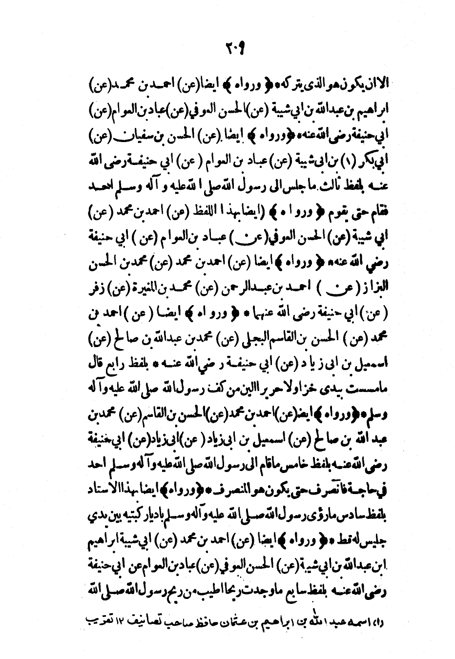 إلا أن يكون هو الذي يتركه* (ورواه) أيضاً (عن) أحمد بن محمد (عن) إبراهيم بن عبد الله بن أبي شيبة (عن) الحسن العوفي (عن) عباد بن العوام (عن) أبي حنيفة رضي الله عنه* (ورواه) أيضاً (عن) الحسن بن سفيان (عن) أبي بكر بن أبي شيبة (عن) عباد بن العوام (عن) أبي حنيفة رضي الله عنه بلفظ ثالث ما جلس إلى رسول الله صلى الله عليه وآله وسلم أحد فقام حتى يقوم (ورواه) أيضاً بهذا اللفظ (عن) أحمد بن محمد (عن) أبي شيبة (عن) الحسن العوفي (عن) عباد بن العوام (عن) أبي حنيفة رضي الله عنه* (ورواه) أيضاً (عن) أحمد بن محمد (عن) محمد بن الحسن البزاز (عن) أحمد بن عبد الرحمن (عن) محمد بن المغيرة (عن) زفر (عن) أبي حنيفة رضي الله عنهما* (ورواه) أيضاً (عن) أحمد بن محمد (عن) الحسن بن القاسم البجلي (عن) محمد بن عبد الله بن صالح (عن) إسماعيل بن أبي زياد (عن) أبي حنيفة رضي الله عنه* بلفظ رابع قال ما مسست بيدي خزاً ولا حريراً ألين من كف رسول الله صلى الله عليه وآله وسلم* (ورواه) أيضاً (عن) أحمد بن محمد (عن) الحسن بن القاسم (عن) محمد بن عبد الله بن صالح (عن) إسماعيل بن أبي زياد (عن) أبي زياد (عن) أبي حنيفة رضي الله عنه بلفظ خامس ما قام إلى رسول الله صلى الله عليه وآله وسلم أحد في حاجة فانصرف حتى يكون هو المنصرف* (ورواه) أيضاً بهذا الإسناد بلفظ سادس ما رؤي رسول الله صلى الله عليه وآله وسلم بادياً ركبتيه بين يدي جليس له قط* (ورواه) أيضاً (عن) أحمد بن محمد (عن) أبي شيبة إبراهيم ابن عبد الله بن أبي شيبة (عن) الحسن العوفي (عن) عباد بن العوام عن أبي حنيفة رضي الله عنه بلفظ سابع ما وجدت ريحاً أطيب من ريح رسول الله صلى الله