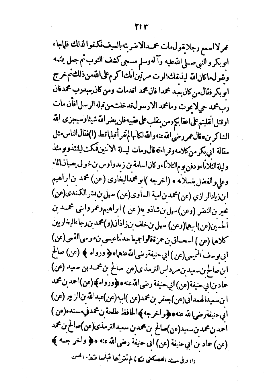 عمر لا أسمع رجلاً يقول مات محمد إلا ضربته بالسيف فكفوا لذلك فلما جاء أبو بكر والنبي صلى الله عليه وآله وسلم مسجى كشف الثوب ثم جعل يلثمه ويقول ما كان الله ليذيقك الموت مرتين إنك أكرم على الله من ذلك ثم خرج أبو بكر فقال من كان يعبد محمداً فإن محمداً قد مات ومن كان يعبد رب محمد فإن رب محمد حي لا يموت {وما محمدٌ إلا رسولٌ قد خلت من قبله الرسل أفإن مات أو قتل انقلبتم على أعقابكم ومن ينقلب على عقبيه فلن يضر الله شيئاً وسيجزي الله الشاكرين} * قال عمر رضي الله عنه والله لكأنها لم تقرأ قبلها قط فقال الناس مثل مقالة أبي بكر من كلامه وقراءته قال ومات ليلة الاثنين فمكث ليلتئذ ويومئذ وليلة الثلاثاء ودفن يوم الثلاثاء وكان أسامة بن زيد وأوس بن خولى يصبان الماء وعلي والفضل يغسلانه* (أخرجه) أبو محمد البخاري (عن) محمد بن إبراهيم ابن زياد الرازي (عن) محمد بن أمية الساوي (عن) سهل بن بشر الكندي (عن) بحير بن النضر (وعن) سهل بن شاذويه (عن) إبراهيم وعمرو ابني محمد بن الحسين (عن) أبيهما (وعن) سهل بن خلف بن زاذان (و) محمد بن رجاء البخاريين كلاهما (عن) إسحاق بن حمزة قالوا جميعاً حدثنا عيسى بن موسى القمي (عن) أبي يوسف التميمي (عن) أبي حنيفة رضي الله عنهما* (ورواه) (عن) صالح ابن صالح بن سعيد بن مرداس الترمذي (عن) صالح بن محمد بن سعيد (عن) حماد بن أبي حنيفة (عن) أبي حنيفة رضي الله عنه* (ورواه) (عن) أحمد بن محمد ابن سعيد الهمداني (عن) جعفر بن محمد (عن) أبيه (عن) عبد الله بن الزبير (عن) أبي حنيفة رضي الله عنه* (وأخرجه) الحافظ طلحة بن محمد في مسنده (عن) أحمد بن محمد بن سعيد (عن) صالح بن محمد بن سعيد الترمذي (عن) صالح بن محمد (عن) حماد بن أبي حنيفة (عن) أبي حنيفة رضي الله عنه* (وأخرجه)