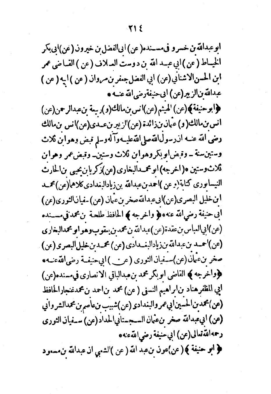 أبو عبد الله بن خسرو في مسنده (عن) أبي الفضل بن خيرون (عن) أبي بكر الخياط (عن) أبي عبد الله بن دوست العلاف (عن) القاضي عمر ابن الحسن الأشناني (عن) أبي الفضل جعفر بن مروان (عن) أبيه (عن) عبد الله بن الزبير (عن) أبي حنيفة رضي الله عنه*