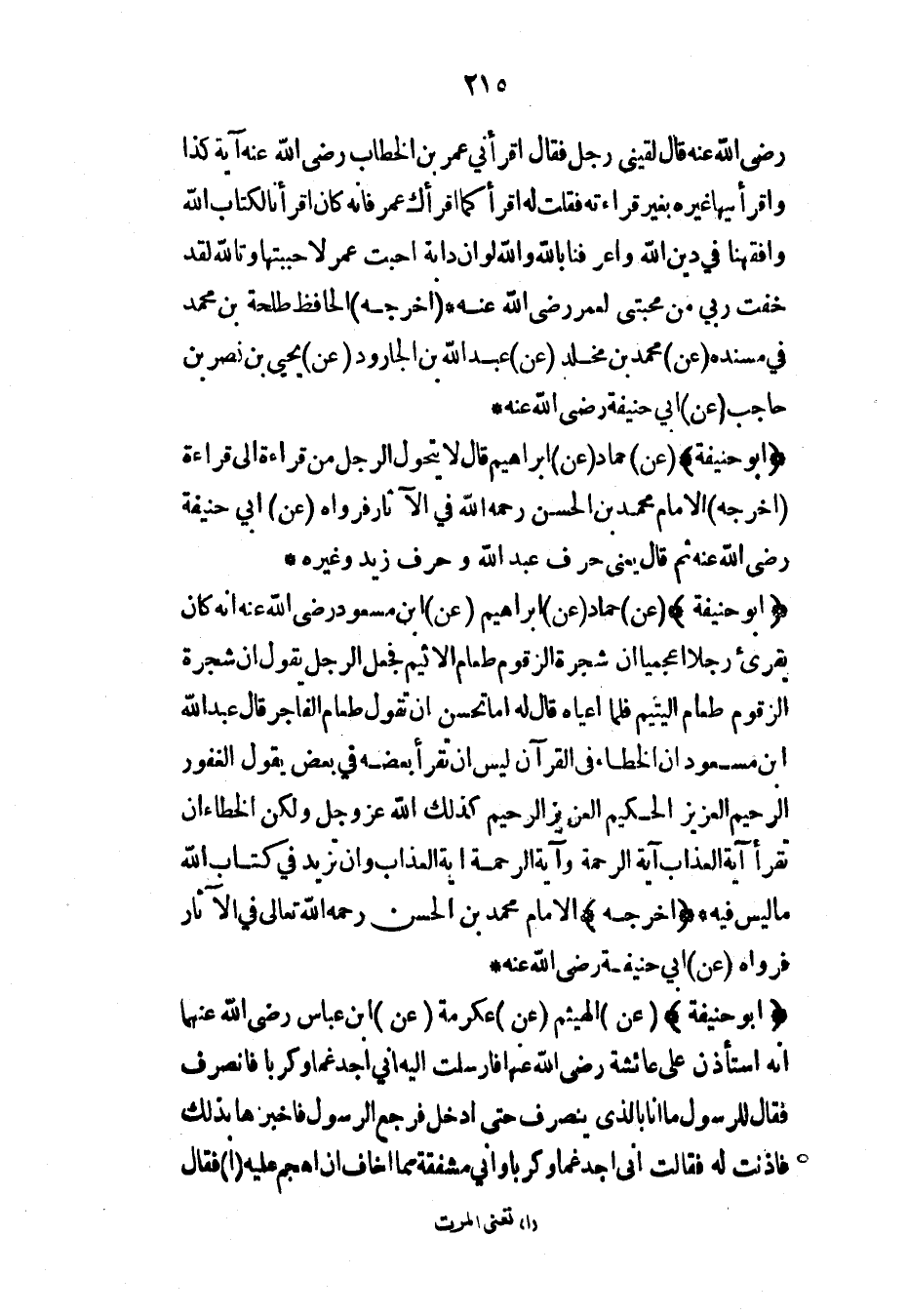 (أبو حنيفة) (عن) حماد (عن) إبراهيم قال لا يتحول الرجال من قراءة إلى قراءة (أخرجه) الإمام محمد بن الحسن رحمه الله في الآثار فرواه (عن) أبي حنيفة رضي الله عنه ثم قال يعني حرف عبد الله وحرف زيد وغيره*