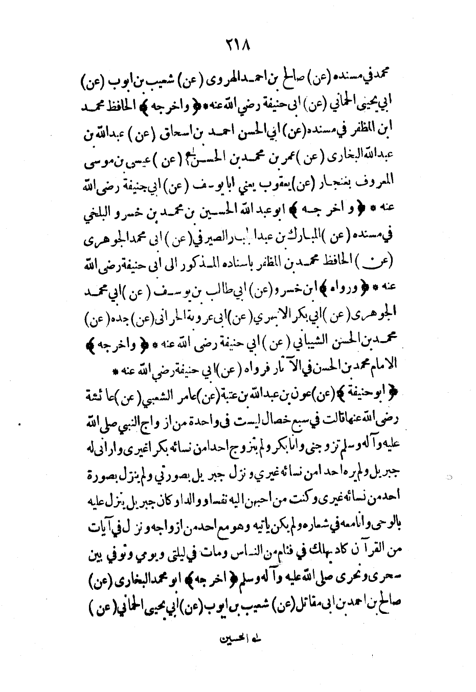 محمد في مسنده (عن) صالح بن أحمد الهروي (عن) شعيب بن أيوب (عن) أبي يحيى الحماني (عن) أبي حنيفة رضي الله عنه* (وأخرجه) الحافظ محمد ابن المظفر في مسنده (عن) أبي الحسن أحمد بن إسحاق (عن) عبد الله بن عبد الله البخاري (عن) عمر بن محمد بن الحسن (عن) عيسى بن موسى المعروف بغنجار (عن) يعقوب يعني أبا يوسف (عن) أبي حنيفة رضي الله عنه* (وأخرجه) أبو عبد الله الحسين بن محمد بن خسرو البلخي في مسنده (عن) المبارك بن عبد الجبار الصيرفي (عن) أبي محمد الجوهري (عن) الحافظ محمد بن المظفر بإسناده المذكور إلى أبي حنيفة رضي الله عنه* (ورواه) ابن خسرو (عن) أبي طالب بن يوسف (عن) أبي محمد الجوهري (عن) أبي بكر الأبهري (عن) أبي عروبة الحراني (عن) جده (عن) محمد بن الحسن الشيباني (عن) أبي حنيفة رضي الله عنه* (وأخرجه) الإمام محمد بن الحسن في الآثار فرواه (عن) أبي حنيفة رضي الله عنه*