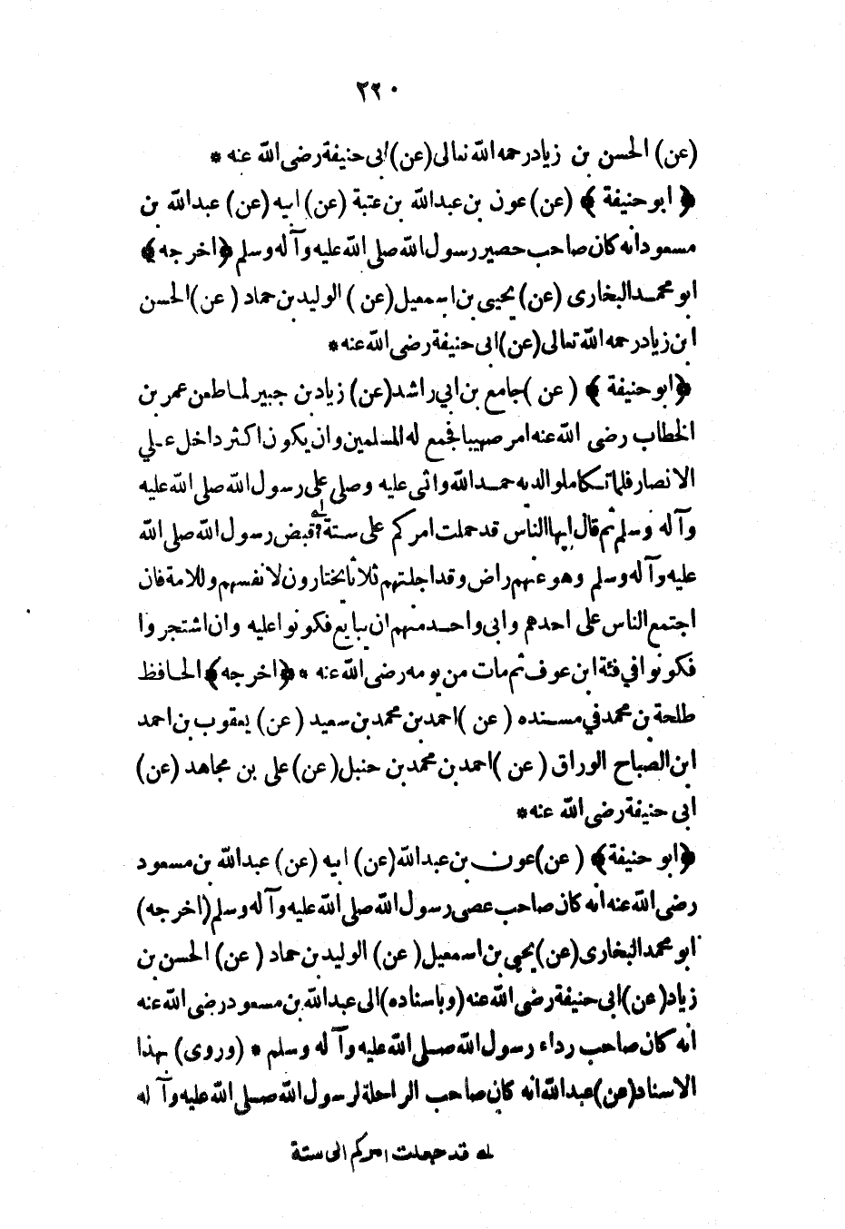 (أبو حنيفة) (عن) عون بن عبد الله (عن) أبيه (عن) عبد الله بن مسعود رضي الله عنه أنه كان صاحب عصى رسول الله صلى الله عليه وآله وسلم (أخرجه) أبو محمد البخاري (عن) يحيى بن إسماعيل (عن) الوليد بن حماد (عن) الحسن بن زياد (عن) أبي حنيفة رضي الله عنه (وبإسناده) إلى عبد الله بن مسعود رضي الله عنه أنه كان صاحب رداء رسول الله صلى الله عليه وآله وسلم* (وروى) بهذا الإسناد (عن) عبد الله أنه كان صاحب الراحلة لرسول الله صلى الله عليه وآله