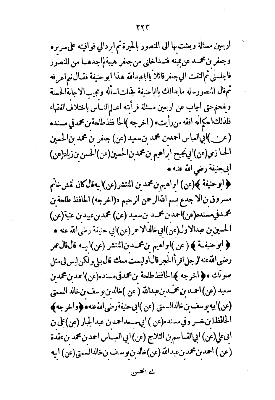 (أبو حنيفة) (عن) إبراهيم بن محمد بن المنتشر (عن) أبيه قال قال عمر رضي الله عنه لرجل اقرأ الحجر قال أوليست معك قال بلى ولكن ليس لي مثل صوتك* (أخرجه) الحافظ طلحة بن محمد في مسنده (عن) أحمد بن محمد بن سعيد (عن) أحمد بن محمد بن عبد الله (عن) خالد بن يوسف بن خالد السمتي (عن) أبيه يوسف بن خالد السمتي (عن) أبي حنيفة رضي الله عنه* (وأخرجه) الحافظ ابن خسرو في مسنده (عن) أبي سعد أحمد بن عبد الجبار (عن) علي بن أبي علي (عن) أبي القاسم بن الثلاج (عن) أبي العباس أحمد بن محمد بن عقدة (عن) أحمد بن محمد بن عبد الله (عن) خالد بن يوسف بن خالد السمتي (عن) أبيه