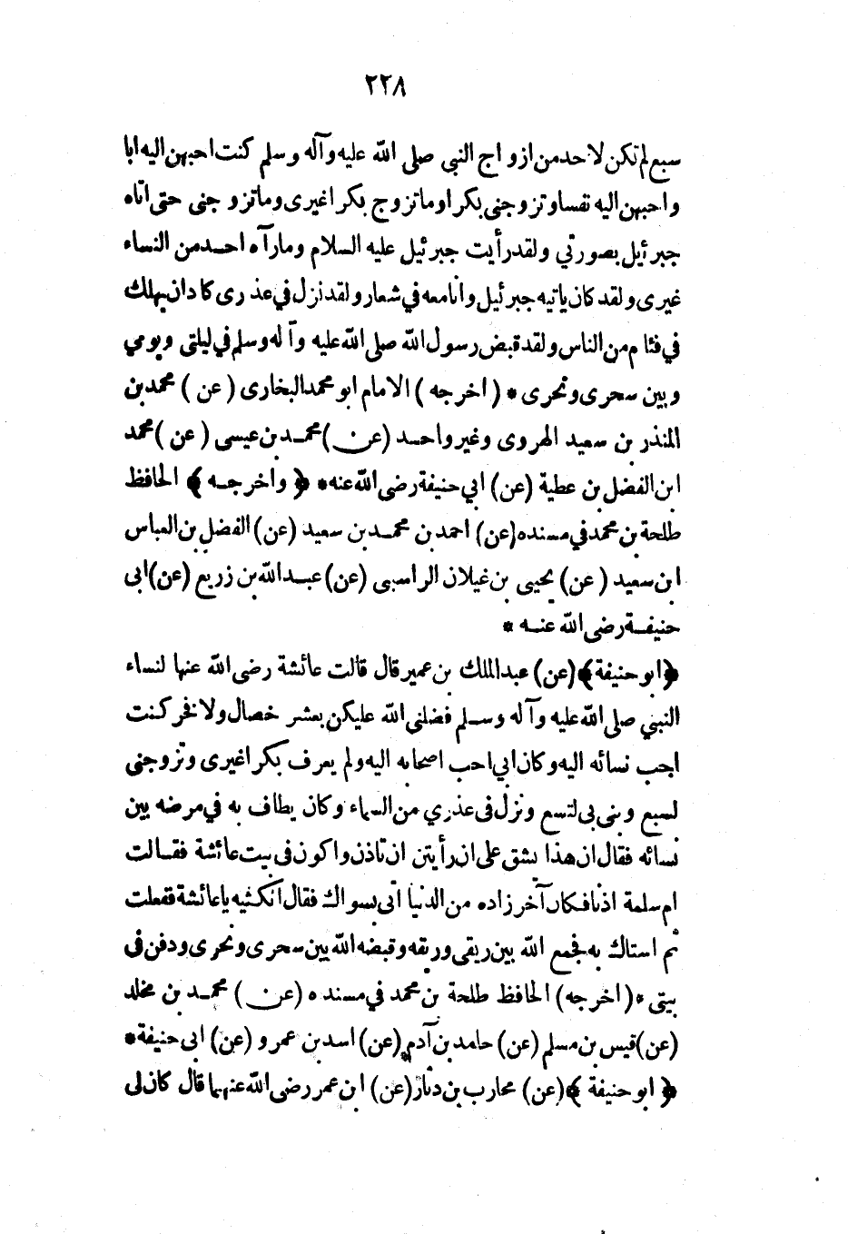 سبع لم تكن لأحد من أزواج النبي صلى الله عليه وآله وسلم كنت أحبهن إليه أباً وأحبهن إليه نفساً وتزوجني بكراً وما تزوج بكراً غيري وما تزوجني حتى أتاه جبرئيل بصورتي ولقد رأيت جبرئيل عليه السلام وما رآه أحد من النساء غيري ولقد كان يأتيه جبرئيل وأنا معه في شعار ولقد نزل في عذري كاد أن يهلك في فئام من الناس ولقد قبض رسول الله صلى الله عليه وآله وسلم في ليلتي ويومي وبين سحري ونحري* (أخرجه) الإمام أبو محمد البخاري (عن) محمد بن المنذر بن سعيد الهروي وغير واحد (عن) محمد بن عيسى (عن) محمد ابن الفضل بن عطية (عن) أبي حنيفة رضي الله عنه* (وأخرجه) الحافظ طلحة بن محمد في مسنده (عن) أحمد بن محمد بن سعيد (عن) الفضل بن العباس ابن سعيد (عن) يحيى بن غيلان الراسبي (عن) عبد الله بن زريع (عن) أبي حنيفة رضي الله عنه*