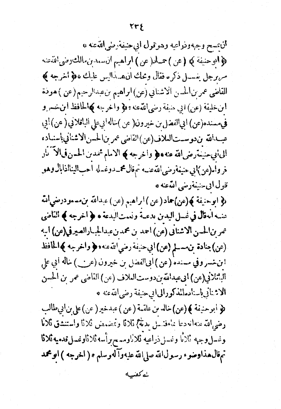 (أبو حنيفة) (عن) حماد (عن) إبراهيم (عن) عبد الله بن مسعود رضي الله عنه أنه قال في غسل اليدين بدعة ونعمت البدعة* (أخرجه) القاضي عمر بن الحسن الأشناني (عن) أحمد بن محمد بن عبد الجبار الصيرفي (عن) أبيه (عن) جنادة بن مسلم (عن) أبي حنيفة رضي الله عنه* (وأخرجه) الحافظ ابن خسرو في مسنده (عن) أبي الفضل بن خيرون (عن) خاله أبي علي الباقلاني (عن) أبي عبد الله بن دوست العلاف (عن) القاضي عمر بن الحسن الأشناني بإسناده المذكور إلى أبي حنيفة رضي الله عنه*