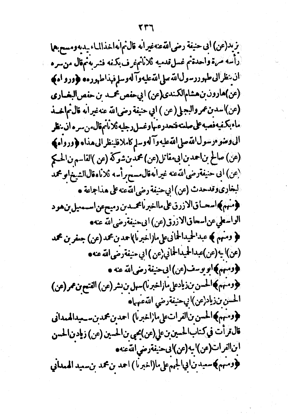 يزيد (عن) أبي حنيفة رضي الله عنه غير أنه قال ثم إنه أخذ الماء بيديه ومسح بهما رأسه مرة واحدة ثم غسل قدميه ثلاثاً ثم غرف بكفه فشربه ثم قال من سره أن ينظر إلى طهور رسول الله صلى الله عليه وآله وسلم فهذا طهوره* (ورواه) (عن) هارون بن هشام الكندي (عن) أبي حفص محمد بن حفص البخاري (عن) أسد بن عمرو البجلي (عن) أبي حنيفة رضي الله عنه غير أنه قال ثم أخذ ماء بكفيه فصبه على صلعته فتحدر عنها وغسل رجليه ثلاثاً ثم قال من سره أن ينظر إلى وضوء رسول الله صلى الله عليه وآله وسلم كاملاً فلينظر إلى هذا* (ورواه) (عن) صالح بن أحمد بن أبي مقاتل (عن) محمد بن شوكة (عن) القاسم بن الحكم (عن) أبي حنيفة رضي الله عنه غير أنه قال مسح برأسه ثلاثاً* قال الشيخ أبو محمد البخاري وقد حدث (عن) أبي حنيفة رضي الله عنه على هذا جماعة*