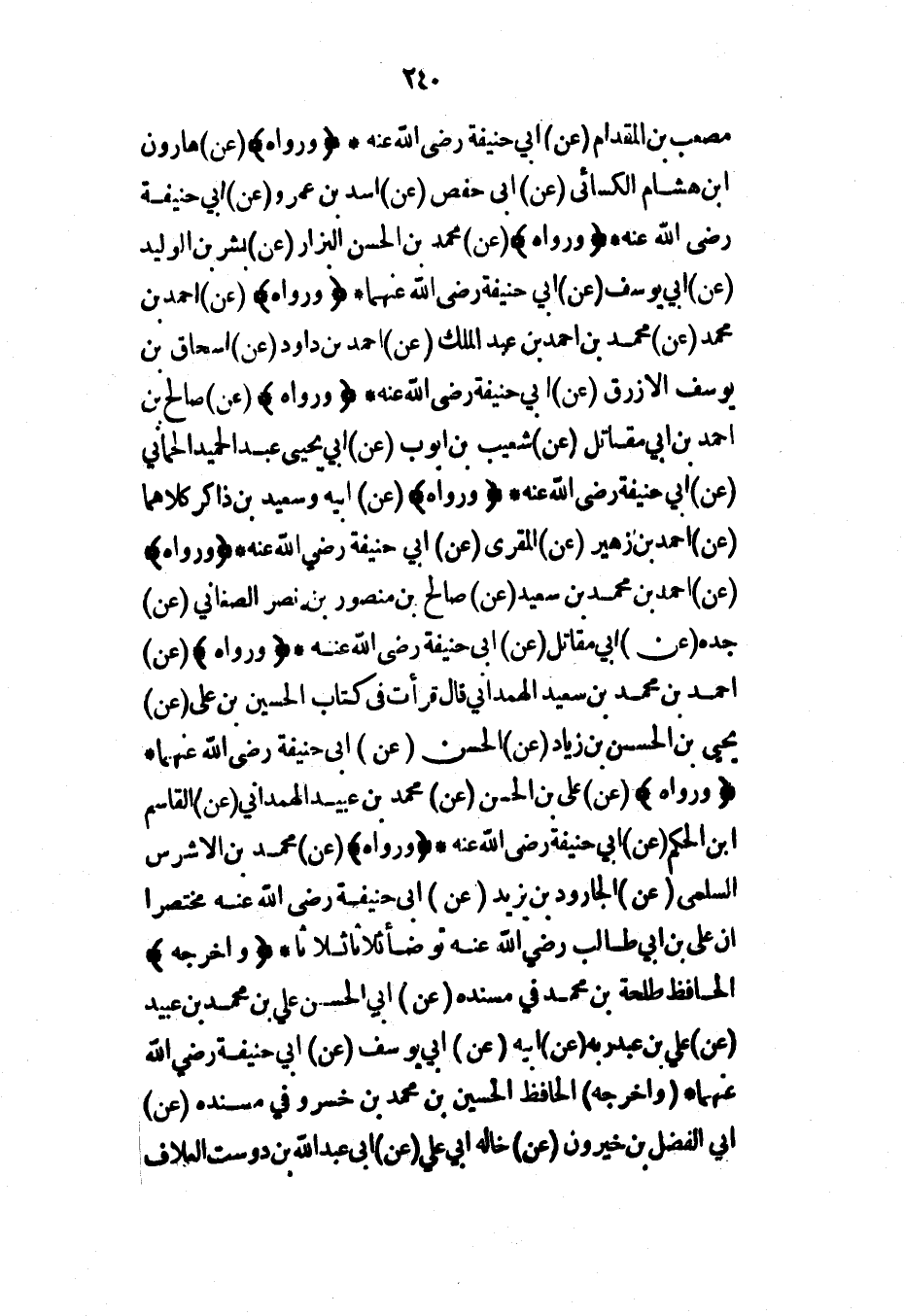 مصعب بن المقدام (عن) أبي حنيفة رضي الله عنه* (ورواه) (عن) هارون ابن هشام الكسائي (عن) أبي حفص (عن) أسد بن عمرو (عن) أبي حنيفة رضي الله عنه* (ورواه) (عن) محمد بن الحسن البزار (عن) بشر بن الوليد (عن) أبي يوسف (عن) أبي حنيفة رضي الله عنهما* (ورواه) (عن) أحمد بن محمد (عن) محمد بن أحمد بن عبد الملك (عن) أحمد بن داود (عن) إسحاق بن يوسف الأزرق (عن) أبي حنيفة رضي الله عنه* (ورواه) (عن) صالح بن أحمد بن أبي مقاتل (عن) شعيب بن أيوب (عن) أبي يحيى عبد الحميد الحماني (عن) أبي حنيفة رضي الله عنه* (ورواه) (عن) أبيه وسعيد بن ذاكر كلاهما (عن) أحمد بن زهير (عن) المقري (عن) أبي حنيفة رضي الله عنه* (ورواه) (عن) أحمد بن محمد بن سعيد (عن) صالح بن منصور بن نصر الصغاني (عن) جده (عن) أبي مقاتل (عن) أبي حنيفة رضي الله عنه* (ورواه) (عن) أحمد بن محمد بن سعيد الهمداني قال قرأت في كتاب الحسين بن علي (عن) يحيى بن الحسن بن زياد (عن) الحسن (عن) أبي حنيفة رضي الله عنهما* (ورواه) (عن) علي بن الحسن (عن) محمد بن عبيد الهمداني (عن) القاسم ابن الحكم (عن) أبي حنيفة رضي الله عنه* (ورواه) (عن) محمد بن الأشرس السلمي (عن) الجارود بن يزيد (عن) أبي حنيفة رضي الله عنه مختصراً أن علي بن أبي طالب رضي الله عنه توضأ ثلاثاً ثلاثاً* (وأخرجه) الحافظ طلحة بن محمد في مسنده (عن) أبي الحسن علي بن محمد بن عبيد (عن) علي بن عبد ربه (عن) أبيه (عن) أبي يوسف (عن) أبي حنيفة رضي الله عنهما* (وأخرجه) الحافظ الحسين بن محمد بن خسرو في مسنده (عن) أبي الفضل بن خيرون (عن) خاله أبي علي (عن) أبي عبد الله بن دوست العلاف