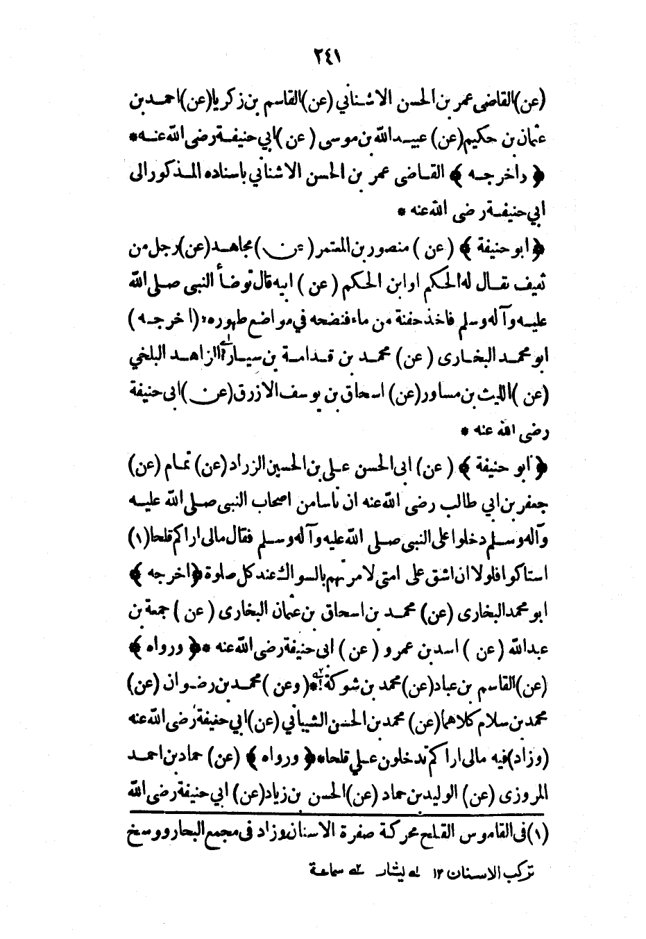 (عن) القاضي عمر بن الحسن الأشناني (عن) القاسم بن زكريا (عن) أحمد بن عثمان بن حكيم (عن) عبيد الله بن موسى (عن) أبي حنيفة رضي الله عنه* (وأخرجه) القاضي عمر بن الحسن الأشناني بإسناده المذكور إلى أبي حنيفة رضي الله عنه*