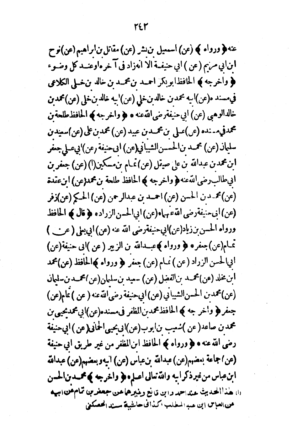 عنه (ورواه) (عن) إسماعيل بن بشر (عن) مقاتل بن إبراهيم (عن) نوح ابن أبي مريم (عن) أبي حنيفة إلا أنه زاد في آخره أو عند كل وضوء (وأخرجه) الحافظ أبو بكر أحمد بن محمد بن خالد بن خلي الكلاعي في مسنده (عن) أبيه محمد بن خالد بن خلي (عن) أبيه خالد بن خلي (عن) محمد بن خالد الوهبي (عن) أبي حنيفة رضي الله عنه* (وأخرجه) الحافظ طلحة بن محمد في مسنده (عن) علي بن محمد بن عبيد (عن) محمد بن علي (عن) سعيد بن سليمان (عن) محمد بن الحسن الشيباني (عن) أبي حنيفة (عن) أبي علي جعفر ابن محمد بن عبد الله بن علي صيقل (عن) تمام بن مسكين (عن) جعفر بن أبي طالب رضي الله عنه (وأخرجه) الحافظ طلحة بن محمد (عن) ابن عقدة (عن) محمد بن الحسن (عن) أحمد بن عبد الرحمن (عن) الحكم (عن) زفر (عن) أبي حنيفة رضي الله عنهما* (عن) أبي الحسن الزراد* (قال) الحافظ ورواه الحسن بن زياد (عن) أبي حنيفة رضي الله عنه (عن) أبي يعلى (عن) تمام (عن) جعفر* (ورواه) عبد الله بن الزبير (عن) أبي حنيفة (عن) أبي الحسن الزراد (عن) تمام (عن) جعفر (ورواه) الحافظ (عن) محمد ابن مخلد (عن) محمد بن الفضل (عن) سعيد بن سليمان (عن) محمد بن سليمان (عن) محمد بن الحسن الشيباني (عن) أبي حنيفة رضي الله عنه (عن) تمام (عن) جعفر (وأخرجه) الحافظ محمد بن المظفر في مسنده (عن) أبي محمد يحيى بن محمد بن صاعد* (عن) شعيب بن أيوب (عن) أبي يحيى الحماني (عن) أبي حنيفة رضي الله عنه* (ورواه) الحافظ ابن المظفر من غير طريق أبي حنيفة (عن) جماعة بعضهم (عن) عبد الله بن عباس (عن) أبيه وبعضهم (عن) عبد الله ابن عباس من غير ذكر أبيه والله تعالى أعلم* (وأخرجه) محمد بن الحسن