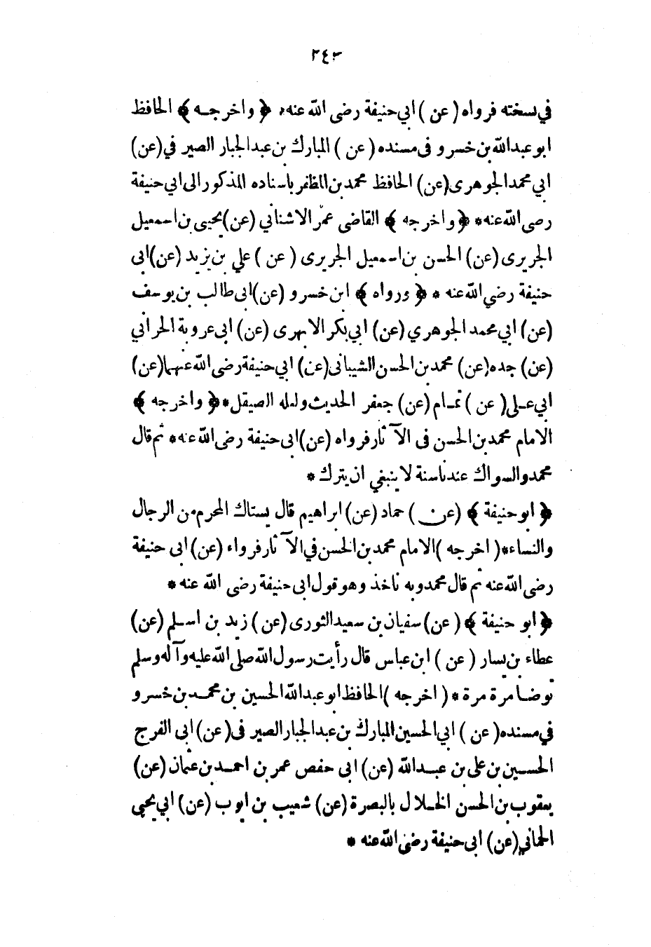 (أبو حنيفة) (عن) سفيان بن سعيد الثوري (عن) زيد بن أسلم (عن) عطاء بن يسار (عن) ابن عباس قال رأيت رسول الله صلى الله عليه وآله وسلم توضأ مرة مرة* (أخرجه) الحافظ أبو عبد الله الحسين بن محمد بن خسرو في مسنده (عن) أبي الحسين المبارك بن عبد الجبار الصيرفي (عن) أبي الفرج الحسين بن علي بن عبد الله (عن) أبي حفص عمر بن أحمد بن عثمان (عن) يعقوب بن الحسن الخلال بالبصرة (عن) شعيب بن أيوب (عن) أبي يحيى الحماني (عن) أبي حنيفة رضي الله عنه*