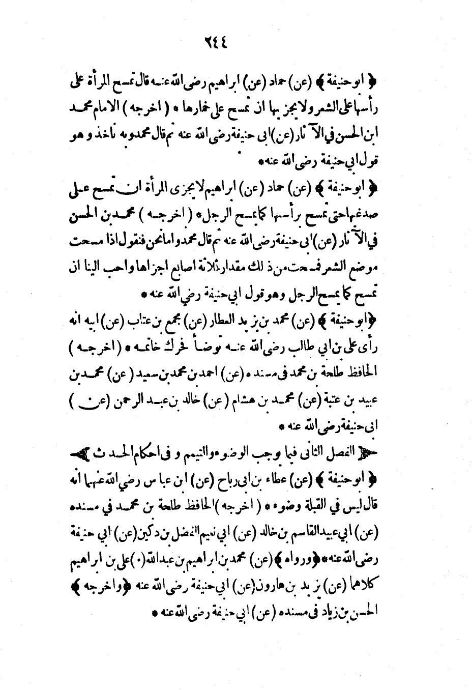 (أبو حنيفة) (عن) محمد بن يزيد العطار (عن) مجمع بن عتاب (عن) أبيه أنه رأى علي بن أبي طالب رضي الله عنه توضأ فحرك خاتمه* (أخرجه) الحافظ طلحة بن محمد في مسنده (عن) أحمد بن محمد بن سعيد (عن) محمد بن عبيد بن عتبة (عن) محمد بن هشام (عن) خالد بن عبد الرحمن (عن) أبي حنيفة رضي الله عنه*