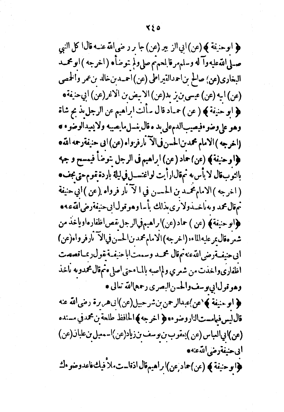 (أبو حنيفة) (عن) أبي الزبير (عن) جابر رضي الله عنه قال أكل النبي صلى الله عليه وآله وسلم مرقاً بلحم ثم صلى ولم يتوضأ* (أخرجه) أبو محمد البخاري (عن) صالح بن أحمد القيراطي (عن) أحمد بن خالد بن عمرو الحمصي (عن) أبيه (عن) عيسى بن يزيد (عن) الأبيض بن الأغر (عن) أبي حنيفة*
