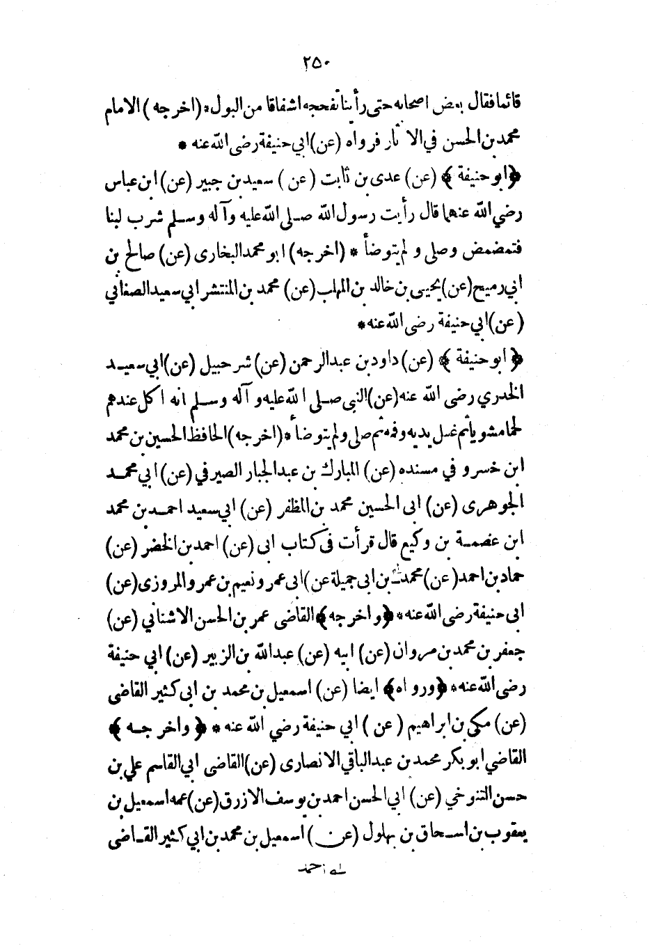 (أبو حنيفة) (عن) داود بن عبد الرحمن (عن) شرحبيل (عن) أبي سعيد الخدري رضي الله عنه (عن) النبي صلى الله عليه وآله وسلم أنه أكل عندهم لحماً مشوياً ثم غسل يديه وفمه ثم صلى ولم يتوضأ* (أخرجه) الحافظ الحسين بن محمد ابن خسرو في مسنده (عن) المبارك بن عبد الجبار الصيرفي (عن) أبي محمد الجوهري (عن) أبي الحسين محمد بن المظفر (عن) أبي سعيد أحمد بن محمد ابن عصمة بن وكيع قال قرأت في كتاب أبي (عن) أحمد بن الخضر (عن) حماد بن أحمد (عن) محمد بن أبي جميلة (عن) أبي عمرو نعيم بن عمرو المروزي (عن) أبي حنيفة رضي الله عنه* (وأخرجه) القاضي عمر بن الحسن الأشناني (عن) جعفر بن محمد بن مروان (عن) أبيه (عن) عبد الله بن الزبير (عن) أبي حنيفة رضي الله عنه* (ورواه) أيضاً (عن) إسماعيل بن محمد بن أبي كثير القاضي (عن) مكي بن إبراهيم (عن) أبي حنيفة رضي الله عنه* (وأخرجه) القاضي أبو بكر محمد بن عبد الباقي الأنصاري (عن) القاضي أبي القاسم علي بن حسن التنوخي (عن) أبي الحسن أحمد بن يوسف الأزرق (عن) عمه إسماعيل بن يعقوب بن إسحاق بن بهلول (عن) إسماعيل بن محمد بن أبي كثير القاضي