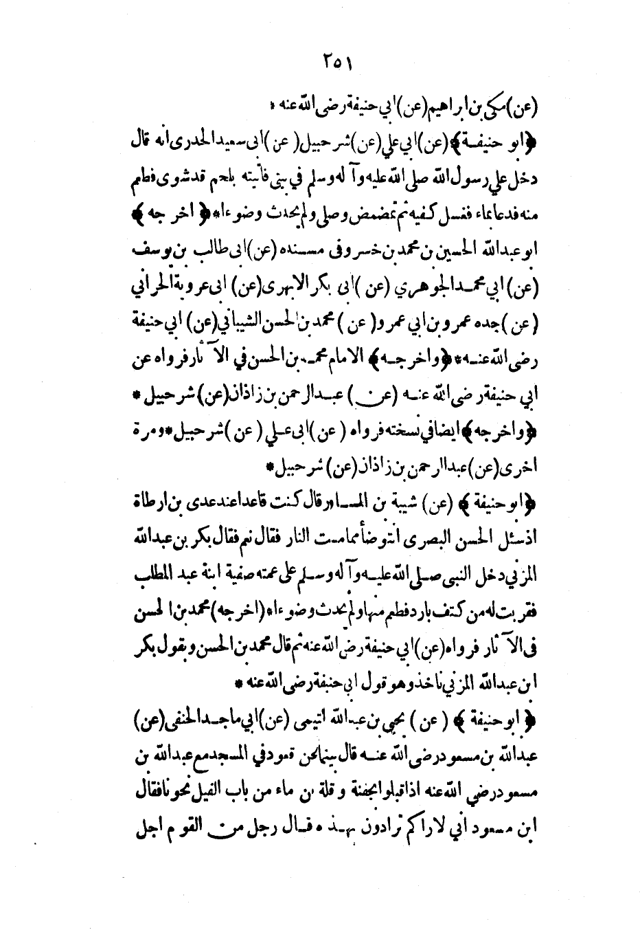 (أبو حنيفة) (عن) أبي علي (عن) شرحبيل (عن) أبي سعيد الخدري أنه قال دخل علي رسول الله صلى الله عليه وآله وسلم في بيتي فأتيته بلحم قد شوي فطعم منه فدعا بماء فغسل كفيه ثم تمضمض وصلى ولم يحدث وضوءاً* (أخرجه) أبو عبد الله الحسين بن محمد بن خسرو في مسنده (عن) أبي طالب بن يوسف (عن) أبي محمد الجوهري (عن) أبي بكر الأبهري (عن) أبي عروبة الحراني (عن) جده عمرو بن أبي عمرو (عن) محمد بن الحسن الشيباني (عن) أبي حنيفة رضي الله عنه* (وأخرجه) الإمام محمد بن الحسن في الآثار فرواه عن أبي حنيفة رضي الله عنه (عن) عبد الرحمن بن زاذان (عن) شرحبيل* (وأخرجه) أيضاً في نسخته فرواه (عن) أبي علي (عن) شرحبيل* ومرة أخرى (عن) عبد الرحمن بن زاذان (عن) شرحبيل*