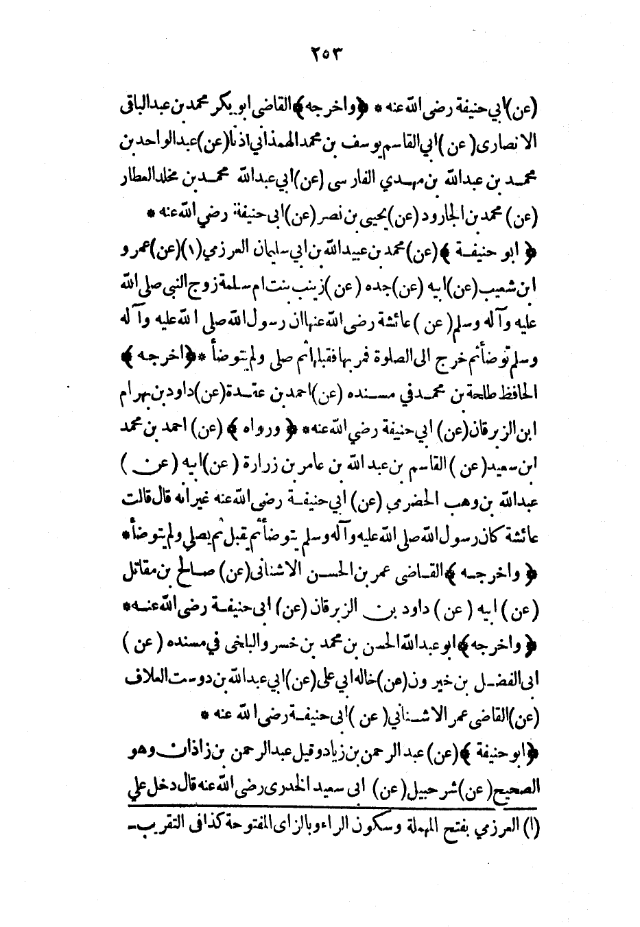 (عن) أبي حنيفة رضي الله عنه* (وأخرجه) القاضي أبو بكر محمد بن عبد الباقي الأنصاري (عن) أبي القاسم يوسف بن محمد الهمذاني إذناً (عن) عبد الواحد بن محمد بن عبد الله بن مهدي الفارسي (عن) أبي عبد الله محمد بن مخلد العطار (عن) محمد بن الجارود (عن) يحيى بن نصر (عن) أبي حنيفة رضي الله عنه*