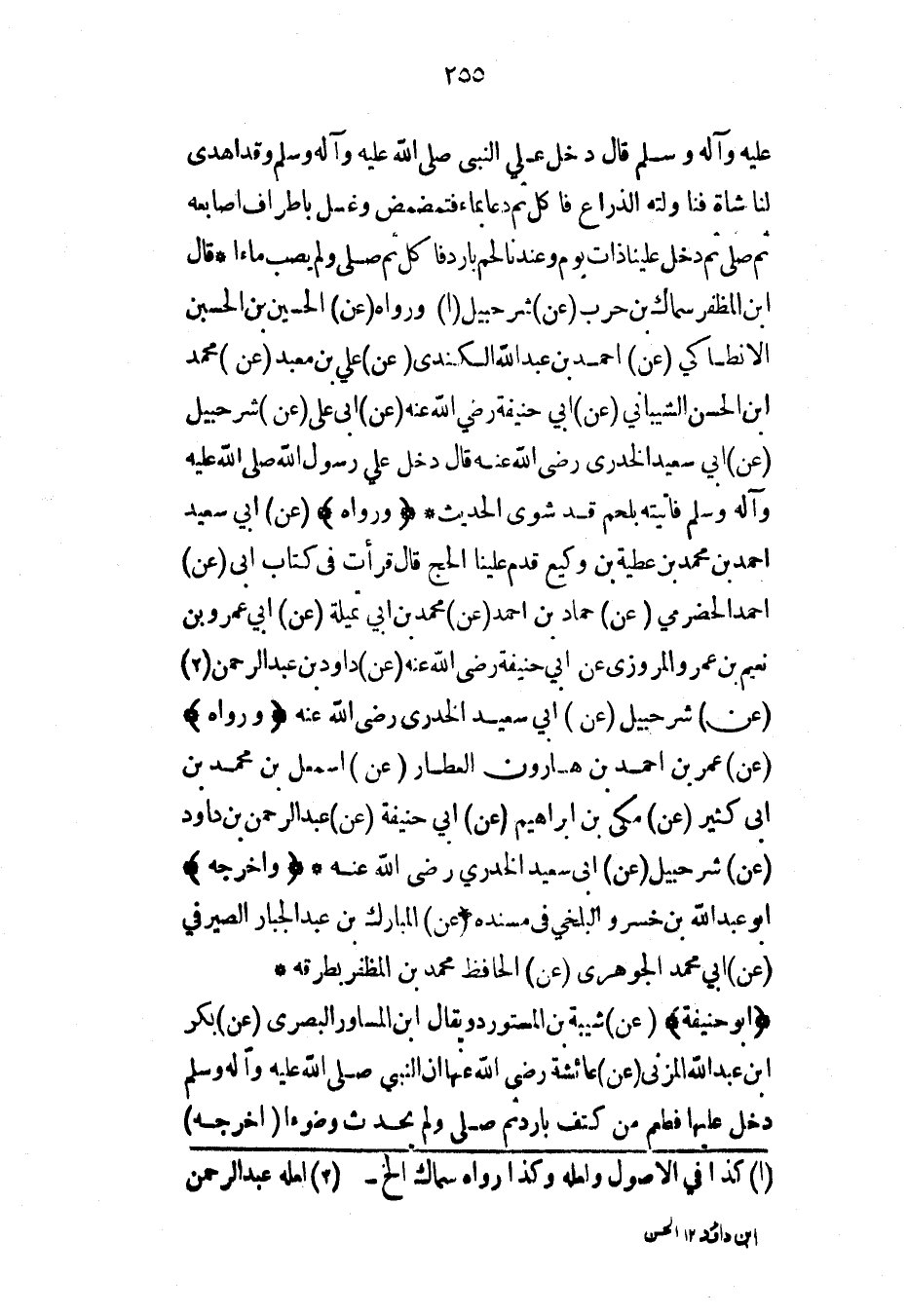 عليه وآله وسلم قال دخل علي النبي صلى الله عليه وآله وسلم وقد أهدي لنا شاةً فناولته الذراع فأكل ثم دعا بماء فتمضمض وغسل بأطراف أصابعه ثم صلى ثم دخل علينا ذات يوم وعندنا لحم بارد فأكل ثم صلى ولم يصب ماءاً* قال ابن المظفر سماك بن حرب (عن) شرحبيل ورواه (عن) الحسين بن الحسين الأنطاكي (عن) أحمد بن عبد الله الكندي (عن) علي بن معبد (عن) محمد ابن الحسن الشيباني (عن) أبي حنيفة رضي الله عنه (عن) أبي علي (عن) شرحبيل (عن) أبي سعيد الخدري رضي الله عنه قال دخل علي رسول الله صلى الله عليه وآله وسلم فأتيته بلحم قد شوي الحديث* (ورواه) (عن) أبي سعيد أحمد بن محمد بن عطية بن وكيع قدم علينا الحج قال قرأت في كتاب أبي (عن) أحمد الحضرمي (عن) حماد بن أحمد (عن) محمد بن أبي تميلة (عن) أبي عمرو بن نعيم بن عمرو المروزي عن أبي حنيفة رضي الله عنه (عن) داود بن عبد الرحمن (عن) شرحبيل (عن) أبي سعيد الخدري رضي الله عنه (ورواه) (عن) عمر بن أحمد بن هارون العطار (عن) إسماعيل بن محمد بن أبي كثير (عن) مكي بن إبراهيم (عن) أبي حنيفة (عن) عبد الرحمن بن داود (عن) شرحبيل (عن) أبي سعيد الخدري رضي الله عنه* (وأخرجه) أبو عبد الله بن خسرو البلخي في مسنده (عن) المبارك بن عبد الجبار الصيرفي (عن) أبي محمد الجوهري (عن) الحافظ محمد بن المظفر بطرقه*