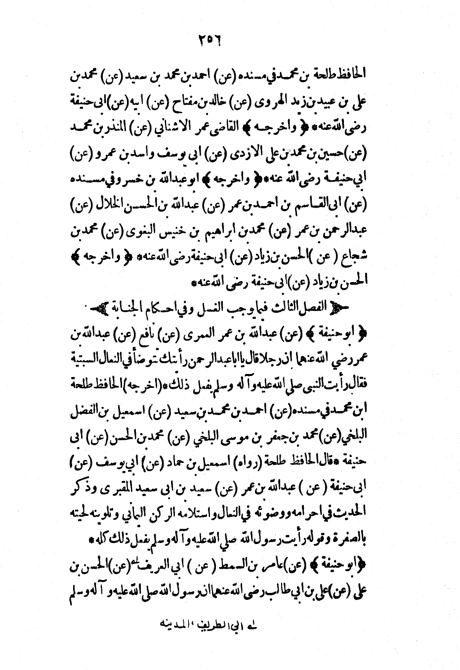 (أبو حنيفة) (عن) عبد الله بن عمر العمري (عن) نافع (عن) عبد الله بن عمر رضي الله عنهما أن رجلاً قال يا أبا عبد الرحمن رأيتك تتوضأ في النعال السبتية فقال رأيت النبي صلى الله عليه وآله وسلم يفعل ذلك* (أخرجه) الحافظ طلحة ابن محمد في مسنده (عن) أحمد بن محمد بن سعيد (عن) إسماعيل بن الفضل البلخي (عن) محمد بن جعفر بن موسى البلخي (عن) محمد بن الحسن (عن) أبي حنيفة* قال الحافظ طلحة (رواه) إسماعيل بن حماد (عن) أبي يوسف (عن) أبي حنيفة (عن) عبد الله بن عمر (عن) سعيد بن أبي سعيد المقبري وذكر الحديث في إحرامه ووضوئه في النعال واستلامه الركن اليماني وتلوينه لحيته بالصفرة وقوله رأيت رسول الله صلى الله عليه وآله وسلم يفعل ذلك كله*