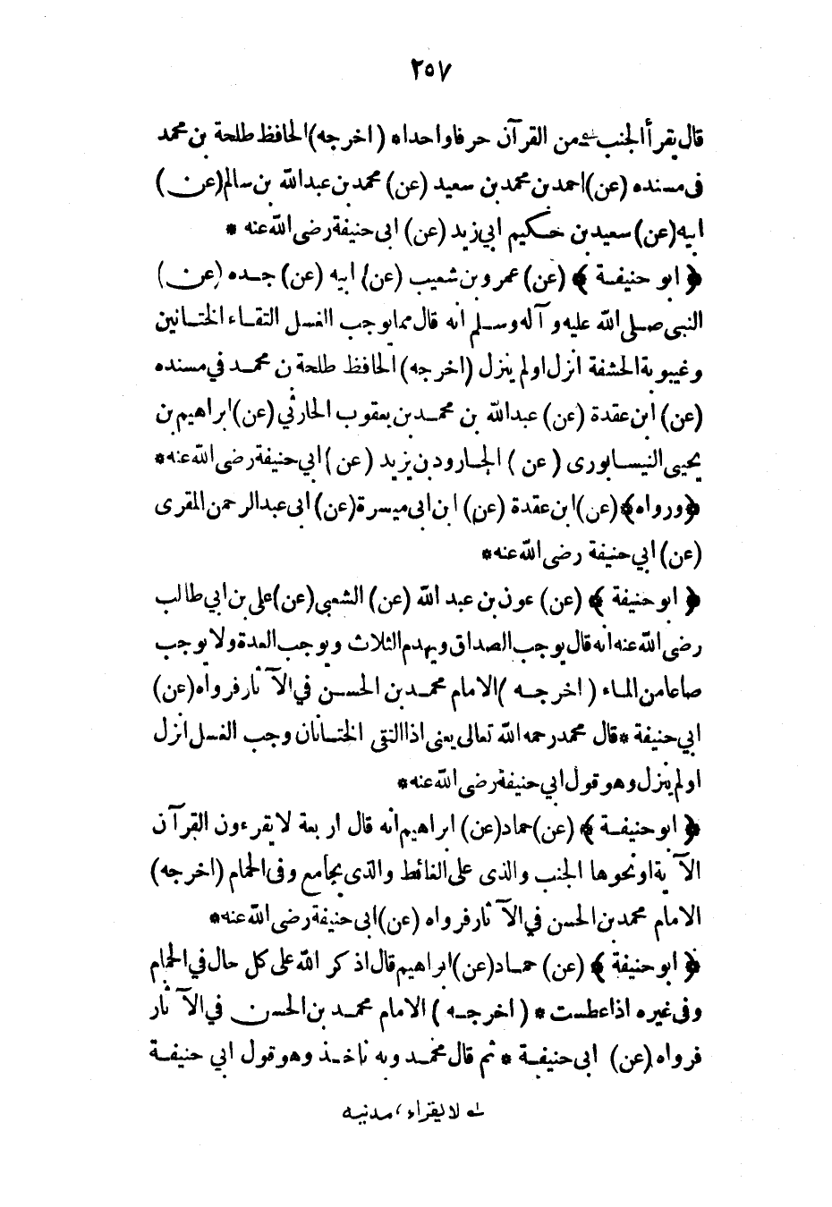 قال يقرأ الجنب من القرآن حرفاً واحداً* (أخرجه) الحافظ طلحة بن محمد في مسنده (عن) أحمد بن محمد بن سعيد (عن) محمد بن عبد الله بن سالم (عن) أبيه (عن) سعيد بن حكيم أبي زيد (عن) أبي حنيفة رضي الله عنه*