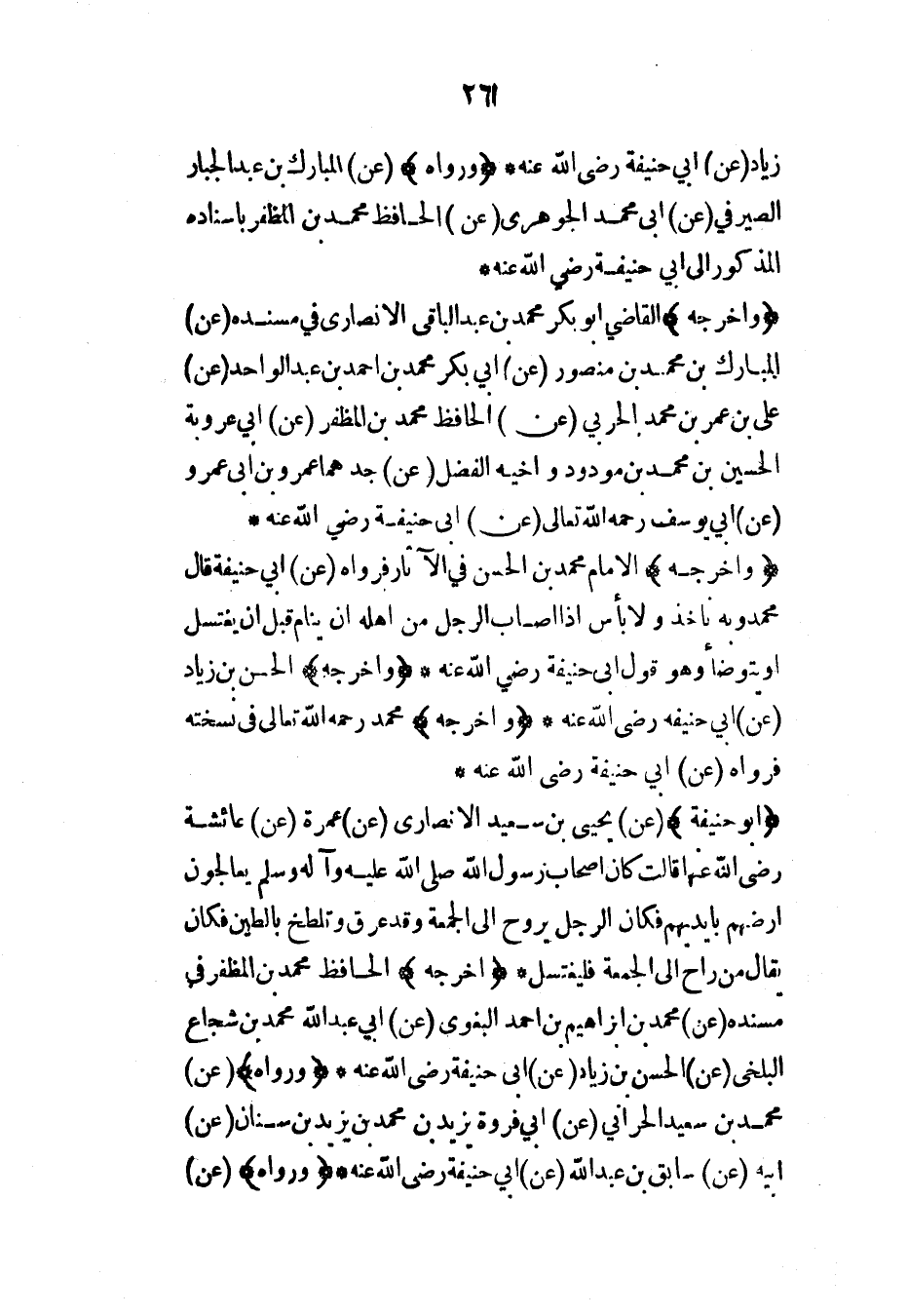 (أبو حنيفة) (عن) يحيى بن سعيد الأنصاري (عن) عمرة (عن) عائشة رضي الله عنها قالت كانت أصحاب رسول الله صلى الله عليه وآله وسلم يعالجون أرضهم بأيديهم فكان الرجل يروح إلى الجمعة وقد عرق وتلطخ بالطين فكان يقال من راح إلى الجمعة فليغتسل* (أخرجه) الحافظ محمد بن المظفر في مسنده (عن) محمد بن إبراهيم بن أحمد البغوي (عن) أبي عبد الله محمد بن شجاع البلخي (عن) الحسن بن زياد (عن) أبي حنيفة رضي الله عنه* (ورواه) (عن) محمد بن سعيد الحراني (عن) أبي فروة يزيد بن محمد بن يزيد بن سنان (عن) أبيه (عن) سابق بن عبد الله (عن) أبي حنيفة رضي الله عنه* (ورواه) (عن)