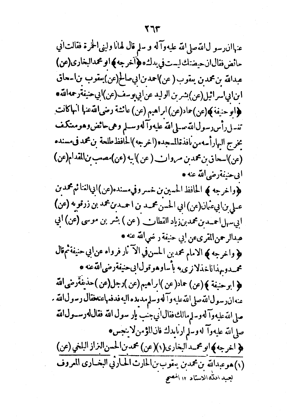 عنها أن رسول الله صلى الله عليه وآله وسلم قال لها ناوليني الخمرة فقالت إني حائض فقال إن حيضتك ليست في يدك* (أخرجه) أبو محمد البخاري (عن) عبد الله بن محمد بن يعقوب (عن) أحمد بن أبي صالح (عن) يعقوب بن إسحاق ابن أبي إسرائيل (عن) بشر بن الوليد عن أبي يوسف (عن) أبي حنيفة رحمه الله*