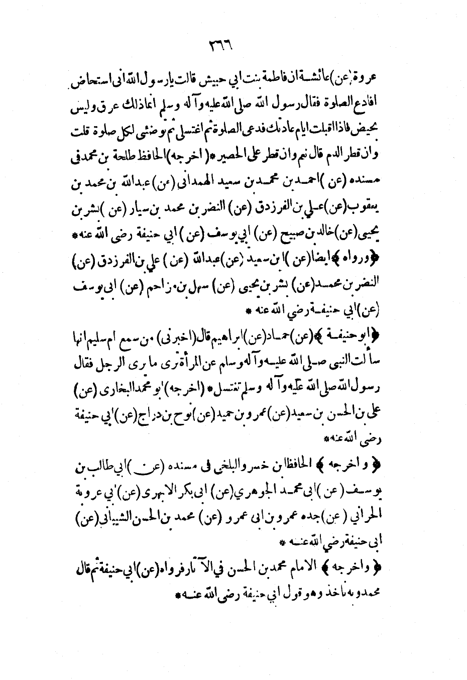 عروة (عن) عائشة أن فاطمة بنت أبي حبيش قالت يا رسول الله إني أستحاض أفأدع الصلاة فقال رسول الله صلى الله عليه وآله وسلم إنما ذلك عرق وليس بحيض فإذا أقبلت أيام عادتك فدعي الصلاة ثم اغتسلي ثم توضئي لكل صلوة قلت وإن قطر الدم قال وإن قطر على الحصير* (أخرجه) الحافظ طلحة بن محمد في مسنده (عن) أحمد بن محمد بن سعيد الهمداني (عن) عبد الله بن محمد بن يعقوب (عن) علي بن الفرزدق (عن) النضر بن محمد بن سيار (عن) بشر بن يحيى (عن) خالد بن صبيح (عن) أبي يوسف (عن) أبي حنيفة رضي الله عنه* (ورواه) أيضاً (عن) ابن سعيد (عن) عبد الله (عن) علي بن الفرزدق (عن) النضر بن محمد (عن) بشر بن يحيى (عن) سهل بن مزاحم (عن) أبي يوسف (عن) أبي حنيفة رضي الله عنه*