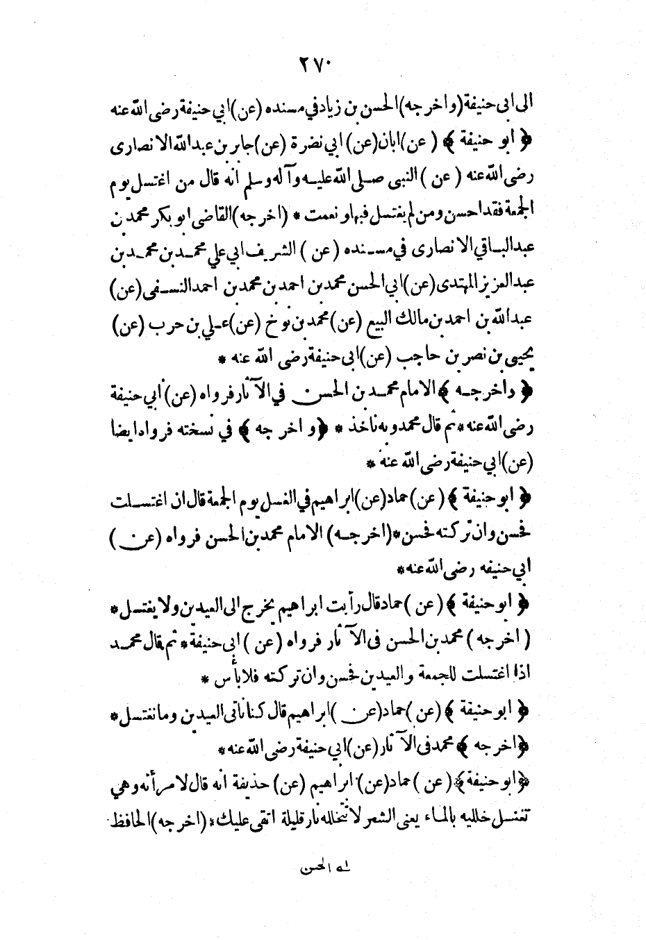 إلى أبي حنيفة (وأخرجه) الحسن بن زياد في مسنده (عن) أبي حنيفة رضي الله عنه (أبو حنيفة) (عن) أبان (عن) أبي نضرة (عن) جابر بن عبد الله الأنصاري رضي الله عنه (عن) النبي صلى الله عليه وآله وسلم أنه قال من اغتسل يوم الجمعة فقد أحسن ومن لم يغتسل فبها ونعمت* (أخرجه) القاضي أبو بكر محمد بن عبد الباقي الأنصاري في مسنده (عن) الشريف أبي علي محمد بن محمد بن عبد العزيز المهتدي (عن) أبي الحسن محمد بن أحمد بن محمد بن أحمد النسفي (عن) عبد الله بن أحمد بن مالك البيع (عن) محمد بن نوح (عن) علي بن حرب (عن) يحيى بن نصر بن حاجب (عن) أبي حنيفة رضي الله عنه*