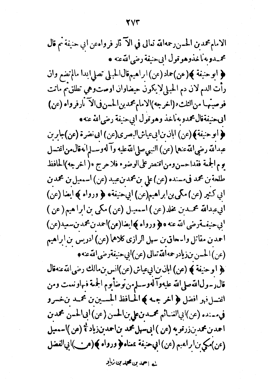 (أبو حنيفة) (عن) أبان بن أبي عياش البصري (عن) أبي نضرة (عن) جابر بن عبد الله رضي الله عنهما (عن) النبي صلى الله عليه وآله وسلم أنه قال من اغتسل يوم الجمعة فقد أحسن ومن اقتصر على الوضوء فلا حرج* (أخرجه) الحافظ طلحة بن محمد في مسنده (عن) علي بن محمد بن عبيد (عن) إسماعيل بن محمد بن أبي كثير (عن) مكي بن إبراهيم (عن) أبي حنيفة* (ورواه) أيضاً (عن) أبي عبد الله محمد بن مخلد (عن) إسماعيل (عن) مكي بن إبراهيم (عن) أبي حنيفة رضي الله عنه* (ورواه) أيضاً (عن) أحمد بن محمد بن سعيد (عن) أحمد بن مقاتل وإسحاق بن سهل الرازي كلاهما (عن) إدريس بن إبراهيم (عن) الحسن بن زياد رحمه الله تعالى (عن) أبي حنيفة رضي الله عنه*