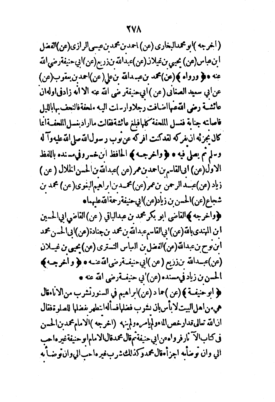 (وأخرجه) القاضي أبو بكر محمد بن عبد الباقي (عن) القاضي أبي الحسين ابن المهتدي بالله (عن) أبي القاسم عبد الله بن محمد بن جنادة (عن) أبي الحسن محمد ابن نوح بن عبد الله (عن) الفضل بن العباس التستري (عن) يحيى بن غيلان (عن) عبد الله بن زريع (عن) أبي حنيفة رضي الله عنه* (وأخرجه) الحسن بن زياد في مسنده (عن) أبي حنيفة رضي الله عنه*