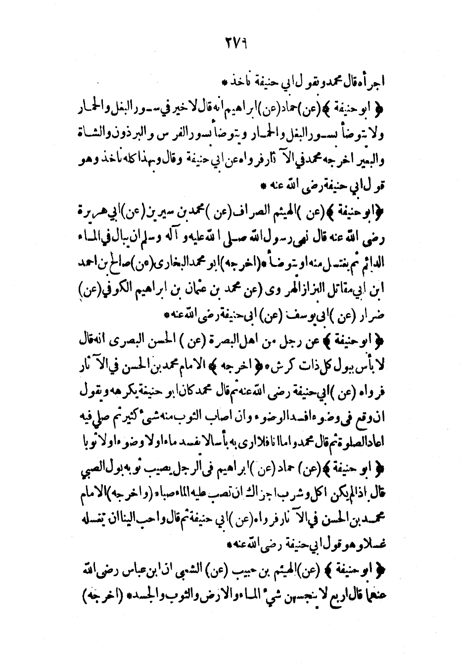 (أبو حنيفة) (عن) الهيثم الصراف (عن) محمد بن سيرين (عن) أبي هريرة رضي الله عنه قال نهى رسول الله صلى الله عليه وآله وسلم أن يبال في الماء الدائم ثم يغتسل منه أو يتوضأ* (أخرجه) أبو محمد البخاري (عن) صالح بن أحمد ابن أبي مقاتل البزاز الهروي (عن) محمد بن عثمان بن إبراهيم الكوفي (عن) ضرار (عن) أبي يوسف (عن) أبي حنيفة رضي الله عنه*