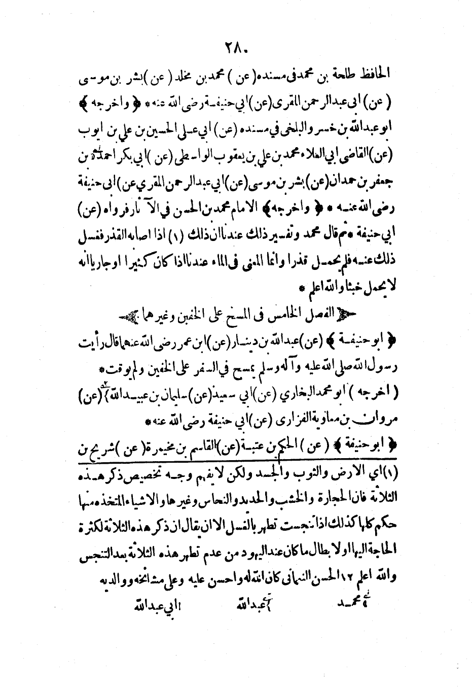 الحافظ طلحة بن محمد في مسنده (عن) محمد بن مخلد (عن) بشر بن موسى (عن) أبي عبد الرحمن المقري (عن) أبي حنيفة رضي الله عنه* (وأخرجه) أبو عبد الله بن خسرو البلخي في مسنده (عن) أبي علي الحسين بن علي بن أيوب (عن) القاضي أبي العلاء محمد بن علي بن يعقوب الواسطي (عن) أبي بكر أحمد بن جعفر بن حمدان (عن) بشر بن موسى (عن) أبي عبد الرحمن المقري (عن) أبي حنيفة رضي الله عنه* (وأخرجه) الإمام محمد بن الحسن في الآثار فرواه (عن) أبي حنيفة* ثم قال محمد وتفسير ذلك عندنا أن ذلك إذا أصابه القذر فغسل ذلك عنه فلم يحمل قذراً وإنما المعنى في الماء عندنا إذا كان كثيراً أو جارياً أنه لا يحمل خبثاً والله أعلم*