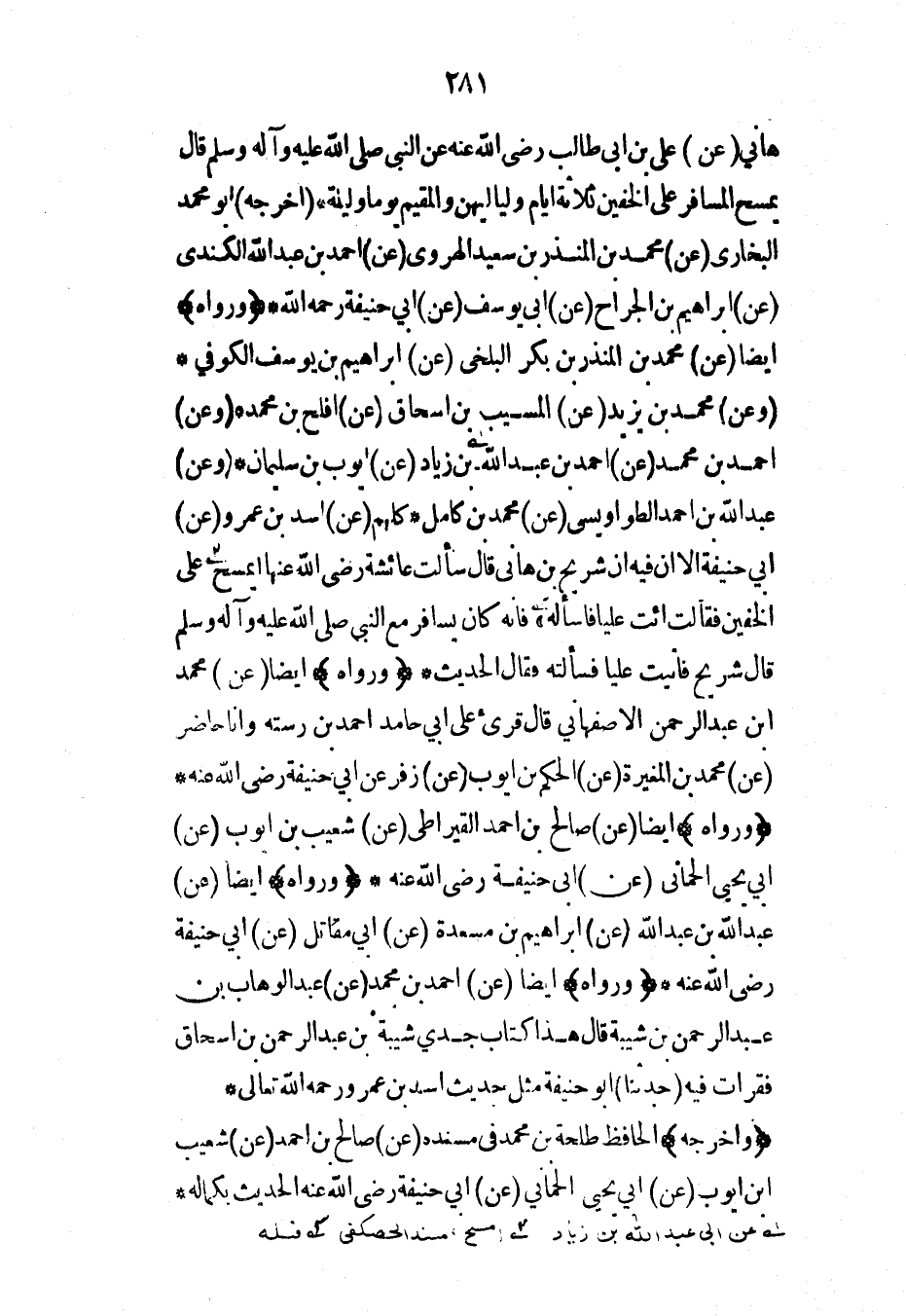 هاني (عن) علي بن أبي طالب رضي الله عنه عن النبي صلى الله عليه وآله وسلم قال يمسح المسافر على الخفين ثلاثة أيام ولياليهن والمقيم يوماً وليلة* (أخرجه) أبو محمد البخاري (عن) محمد بن المنذر بن سعيد الهروي (عن) أحمد بن عبد الله الكندي (عن) إبراهيم بن الجراح (عن) أبي يوسف (عن) أبي حنيفة رحمه الله* (ورواه) أيضاً (عن) محمد بن المنذر بن بكر البلخي (عن) إبراهيم بن يوسف الكوفي* (وعن) محمد بن يزيد (عن) المسيب بن إسحاق (عن) أفلح بن محمد* (وعن) أحمد بن محمد (عن) أحمد بن عبد الله بن زياد (عن) أيوب بن سليمان* (وعن) عبد الله بن أحمد الطواويسي (عن) محمد بن كامل* كلهم (عن) أسد بن عمرو (عن) أبي حنيفة إلا أن فيه أن شريح بن هاني قال سألت عائشة رضي الله عنها أيمسح على الخفين فقالت ائت علياً فاسأله فإنه كان يسافر مع النبي صلى الله عليه وآله وسلم قال شريح فأتيت علياً فسألته فقال الحديث* (ورواه) أيضاً (عن) محمد ابن عبد الرحمن الأصفهاني قال قرئ على أبي حامد أحمد بن رسته وأنا حاضر (عن) محمد بن المغيرة (عن) الحكم بن أيوب (عن) زفر عن أبي حنيفة رضي الله عنه* (ورواه) أيضاً (عن) صالح بن أحمد القيراطي (عن) شعيب بن أيوب (عن) أبي يحيى الحماني (عن) أبي حنيفة رضي الله عنه* (ورواه) أيضاً (عن) عبد الله بن عبد الله (عن) إبراهيم بن مسعدة (عن) أبي مقاتل (عن) أبي حنيفة رضي الله عنه* (ورواه) أيضاً (عن) أحمد بن محمد (عن) عبد الوهاب بن عبد الرحمن بن شيبة قال هذا كتاب جدي شيبة بن عبد الرحمن بن إسحاق فقرأت فيه (حدثنا) أبو حنيفة مثل حديث أسد بن عمرو رحمه الله تعالى*