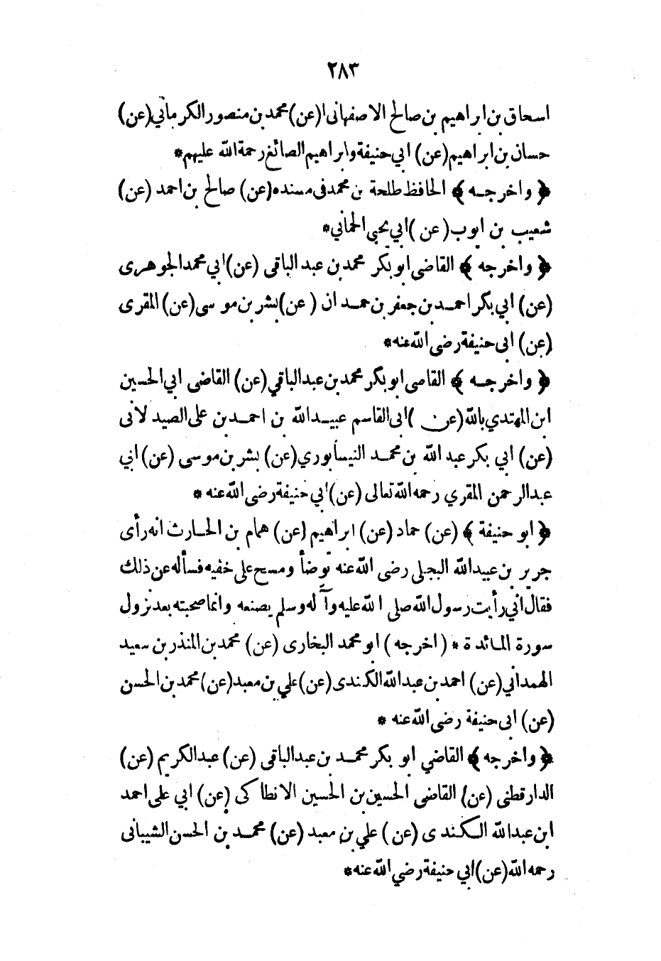 (وأخرجه) القاضي أبو بكر محمد بن عبد الباقي (عن) عبد الكريم (عن) الدارقطني (عن) القاضي الحسين بن الحسين الأنطاكي (عن) أبي علي أحمد ابن عبد الله الكندي (عن) علي بن معبد (عن) محمد بن الحسن الشيباني رحمه الله (عن) أبي حنيفة رضي الله عنه*