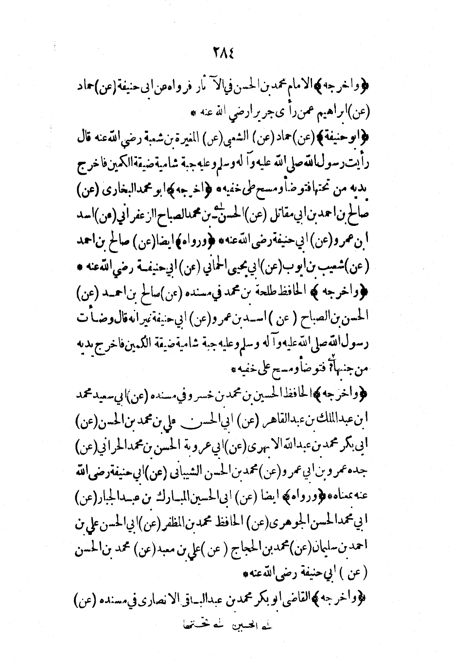 (أبو حنيفة) (عن) حماد (عن) الشعبي (عن) المغيرة بن شعبة رضي الله عنه قال رأيت رسول الله صلى الله عليه وآله وسلم وعليه جبة شامية ضيقة الكمين فأخرج يديه من تحتها فتوضأ ومسح على خفيه* (أخرجه) أبو محمد البخاري (عن) صالح بن أحمد بن أبي مقاتل (عن) الحسن بن محمد الصباح الزعفراني (عن) أسد ابن عمرو (عن) أبي حنيفة رضي الله عنه* (ورواه) أيضاً (عن) صالح بن أحمد (عن) شعيب بن أيوب (عن) أبي يحيى الحماني (عن) أبي حنيفة رضي الله عنه* (وأخرجه) الحافظ طلحة بن محمد في مسنده (عن) صالح بن أحمد (عن) الحسن بن الصباح (عن) أسد بن عمرو (عن) أبي حنيفة غير أنه قال وضأت رسول الله صلى الله عليه وآله وسلم وعليه جبة شامية ضيقة الكمين فأخرج يديه من جنبها فتوضأ ومسح على خفيه*