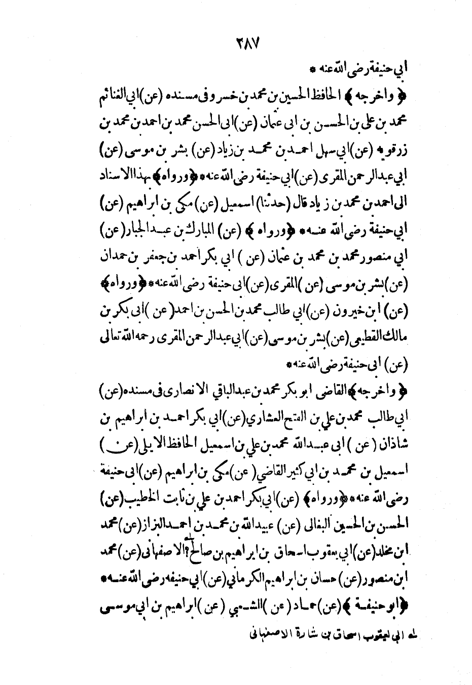 (وأخرجه) القاضي أبو بكر محمد بن عبد الباقي الأنصاري في مسنده (عن) أبي طالب محمد بن علي بن الفتح العشاري (عن) أبي بكر أحمد بن إبراهيم بن شاذان (عن) أبي عبد الله محمد بن علي بن إسماعيل الحافظ الأيلي (عن) إسماعيل بن محمد بن أبي كثير القاضي (عن) مكي بن إبراهيم (عن) أبي حنيفة رضي الله عنه* (ورواه) (عن) أبي بكر أحمد بن علي بن ثابت الخطيب (عن) الحسن بن الحسين البغالي (عن) عبيد الله بن محمد بن أحمد البزاز (عن) محمد ابن مخلد (عن) أبي يعقوب إسحاق بن إبراهيم بن صالح الأصفهاني (عن) محمد ابن منصور (عن) حسان بن إبراهيم الكرماني (عن) أبي حنيفة رضي الله عنه*