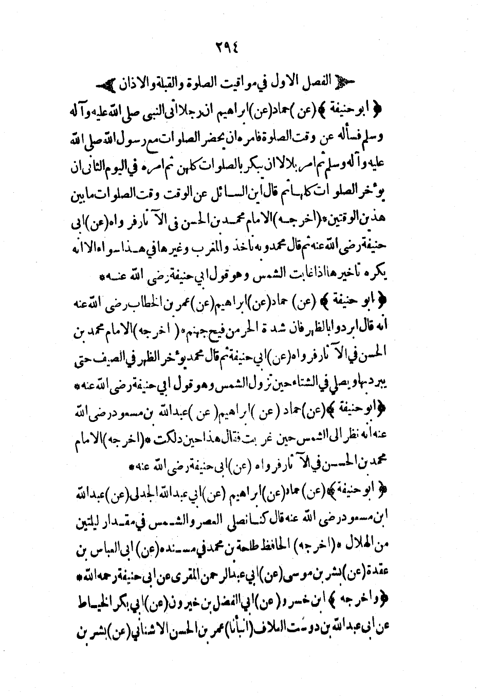 (أبو حنيفة) (عن) حماد (عن) إبراهيم (عن) أبي عبد الله الجدلي (عن) عبد الله ابن مسعود رضي الله عنه قال كنا نصلي العصر والشمس في مقدار ليلتين من الهلال* (أخرجه) الحافظ طلحة بن محمد في مسنده (عن) أبي العباس بن عقدة (عن) بشر بن موسى (عن) أبي عبد الرحمن المقري عن أبي حنيفة رحمه الله* (وأخرجه) ابن خسرو (عن) أبي الفضل بن خيرون (عن) أبي بكر الخياط عن أبي عبد الله بن دوست العلاف (أنبأنا) عمر بن الحسن الأشناني (عن) بشر بن