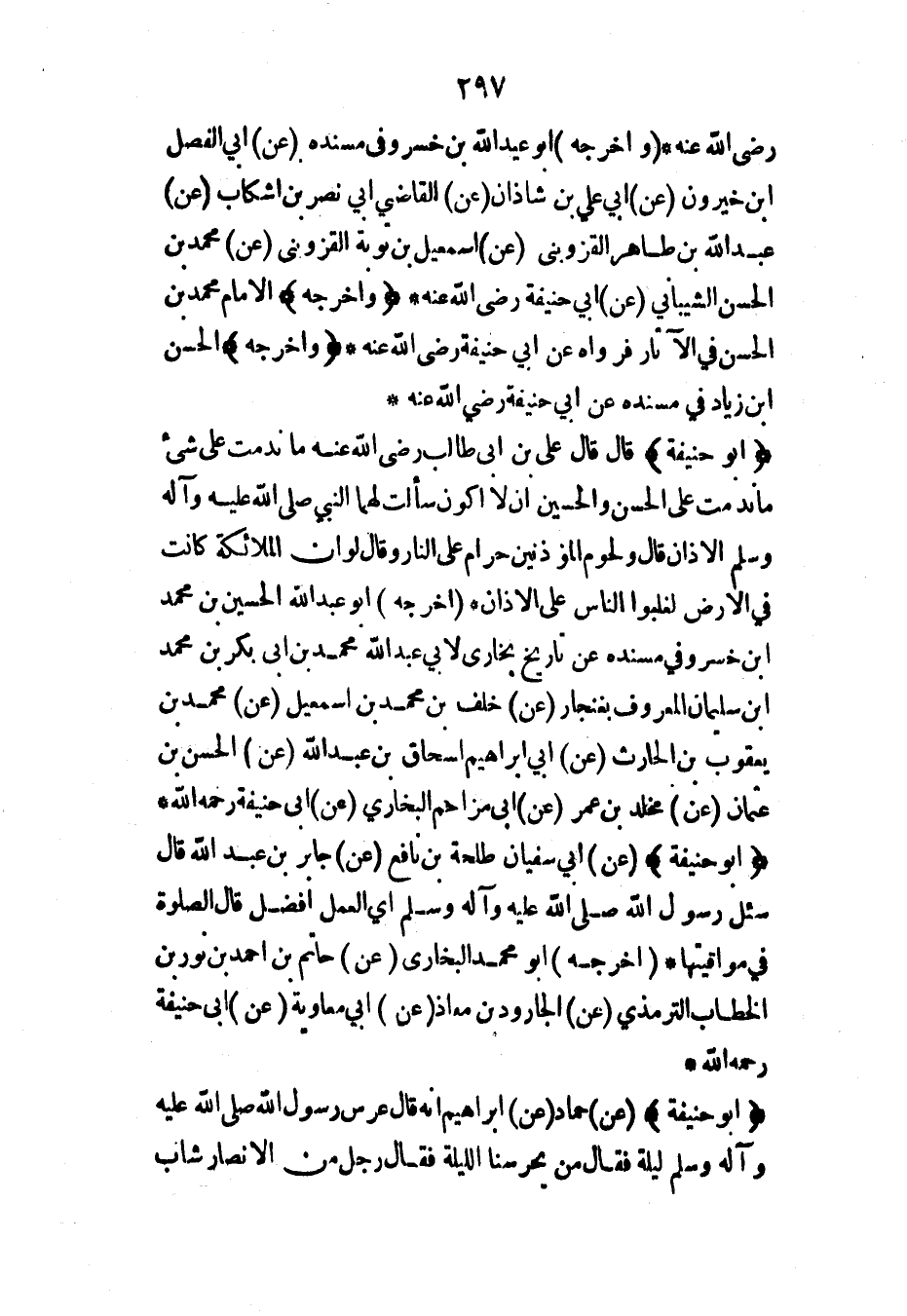 رضي الله عنه* (وأخرجه) أبو عبد الله بن خسرو في مسنده (عن) أبي الفضل ابن خيرون (عن) أبي علي بن شاذان (عن) القاضي أبي نصر بن اشكاب (عن) عبد الله بن طاهر القزويني (عن) إسماعيل بن توبة القزويني (عن) محمد بن الحسن الشيباني (عن) أبي حنيفة رضي الله عنه* (وأخرجه) الإمام محمد بن الحسن في الآثار فرواه عن أبي حنيفة رضي الله عنه* (وأخرجه) الحسن ابن زياد في مسنده عن أبي حنيفة رضي الله عنه*