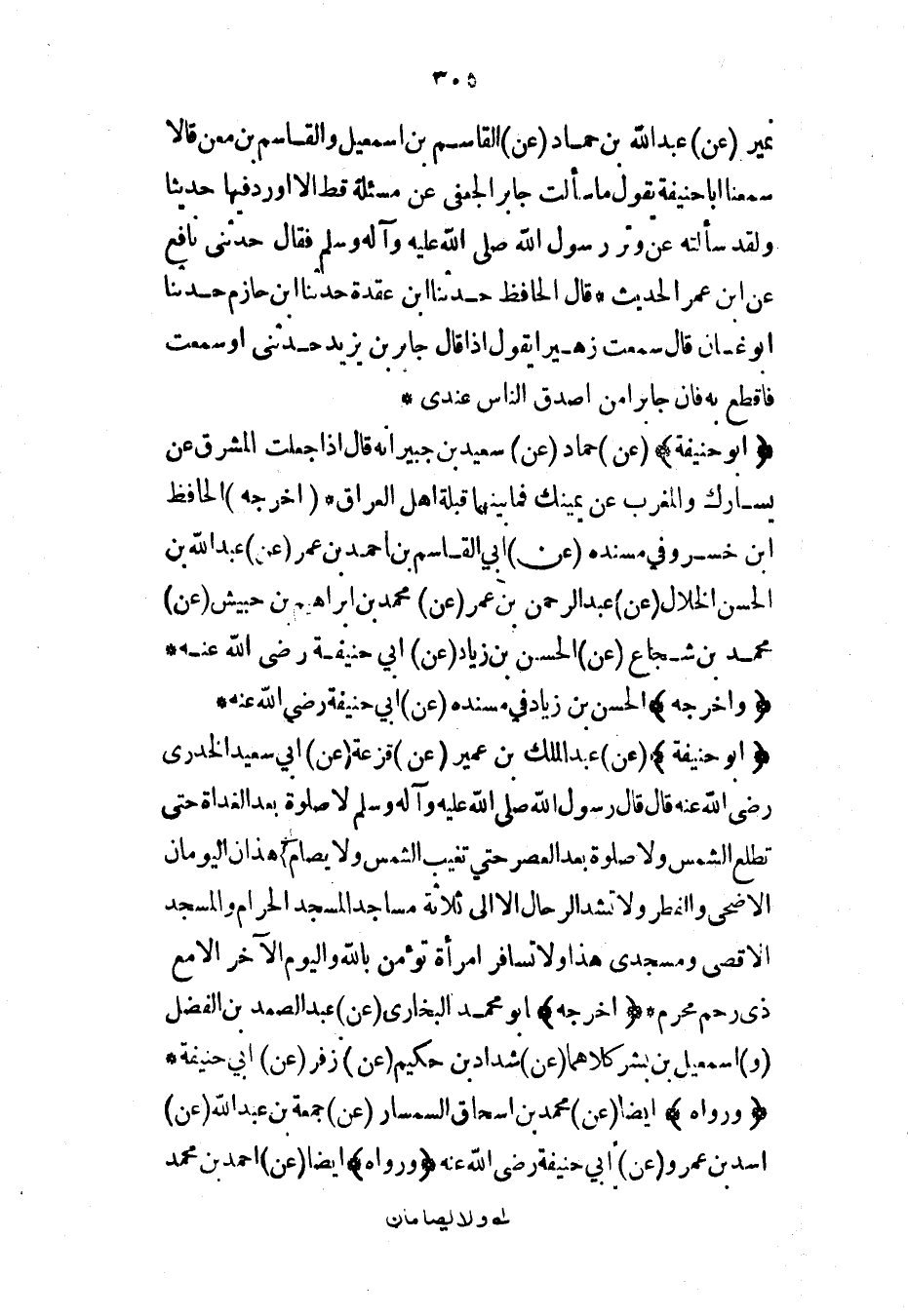 (أبو حنيفة) (عن) عبد الملك بن عمير (عن) قزعة (عن) أبي سعيد الخدري رضي الله عنه قال قال رسول الله صلى الله عليه وآله وسلم لا صلوة بعد الغداة حتى تطلع الشمس ولا صلوة بعد العصر حتى تغيب الشمس ولا يصام هذان اليومان الأضحى والفطر ولا تشد الرحال إلا إلى ثلاثة مساجد المسجد الحرام والمسجد الأقصى ومسجدي هذا ولا تسافر امرأة تؤمن بالله واليوم الآخر إلا مع ذي رحم محرم* (أخرجه) أبو محمد البخاري (عن) عبد الصمد بن الفضل (و) إسماعيل بن بشر كلاهما (عن) شداد بن حكيم (عن) زفر (عن) أبي حنيفة* (ورواه) أيضاً (عن) محمد بن إسحاق السمسار (عن) جمعة بن عبد الله (عن) أسد بن عمرو (عن) أبي حنيفة رضي الله عنه (ورواه) أيضاً (عن) أحمد بن محمد