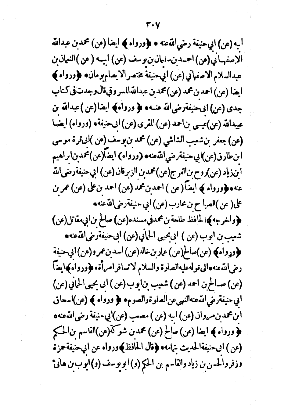 أبيه (عن) أبي حنيفة رضي الله عنه* (ورواه) أيضاً (عن) محمد بن عبد الله الأصفهاني (عن) أحمد بن سليمان بن يوسف (عن) أبيه (عن) النعمان بن عبد السلام الأصفهاني (عن) أبي حنيفة مختصراً لا يصام يومان* (ورواه) أيضاً (عن) أحمد بن محمد (عن) محمد بن عبد الله المسروقي قال وجدت في كتاب جدي (عن) أبي حنيفة رضي الله عنه* (ورواه) أيضاً (عن) عبد الله بن عبيد الله (عن) عيسى بن أحمد (عن) المقري (عن) أبي حنيفة* (ورواه) أيضاً (عن) جعفر بن شعيب الشاشي (عن) محمد بن يوسف (عن) أبي قرة موسى ابن طارق (عن) أبي حنيفة رضي الله عنه* (ورواه) أيضاً (عن) محمد بن إبراهيم ابن زياد (عن) روح بن الفرج (عن) محمد بن الزبرقان (عن) أبي حنيفة رضي الله عنه* (ورواه) أيضاً (عن) أحمد بن محمد (عن) أحمد بن علي (عن) عمر بن علي (عن) الصباح بن محارب (عن) أبي حنيفة رضي الله عنه*