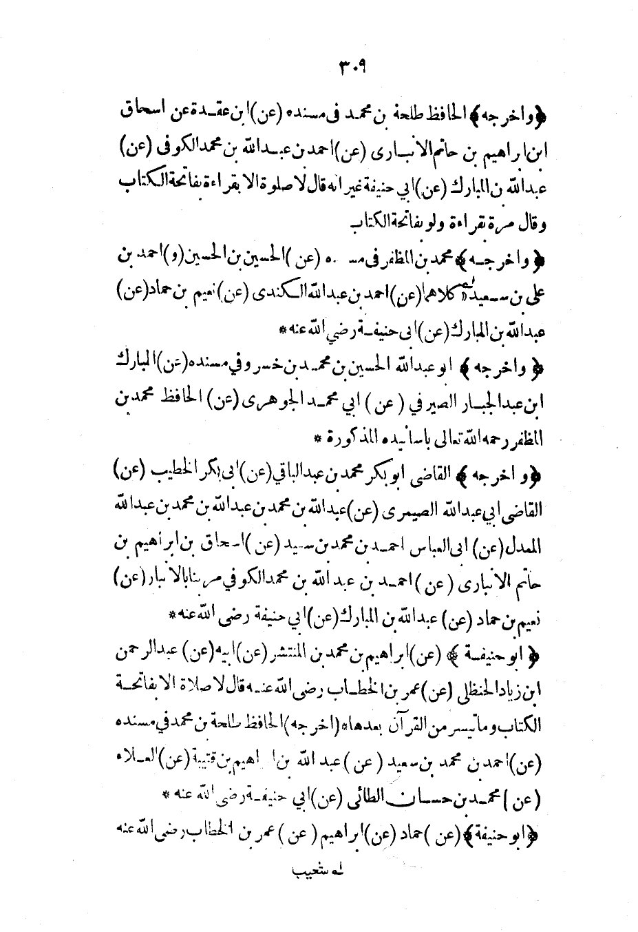 (أبو حنيفة) (عن) إبراهيم بن محمد بن المنتشر (عن) أبيه (عن) عبد الرحمن ابن زياد الحنظلي (عن) عمر بن الخطاب رضي الله عنه قال لا صلاة إلا بفاتحة الكتاب وما تيسر من القرآن بعدها* (أخرجه) الحافظ طلحة بن محمد في مسنده (عن) أحمد بن محمد بن سعيد (عن) عبد الله بن إبراهيم بن قتيبة (عن) العلاء (عن) محمد بن حسان الطائي (عن) أبي حنيفة رضي الله عنه*
