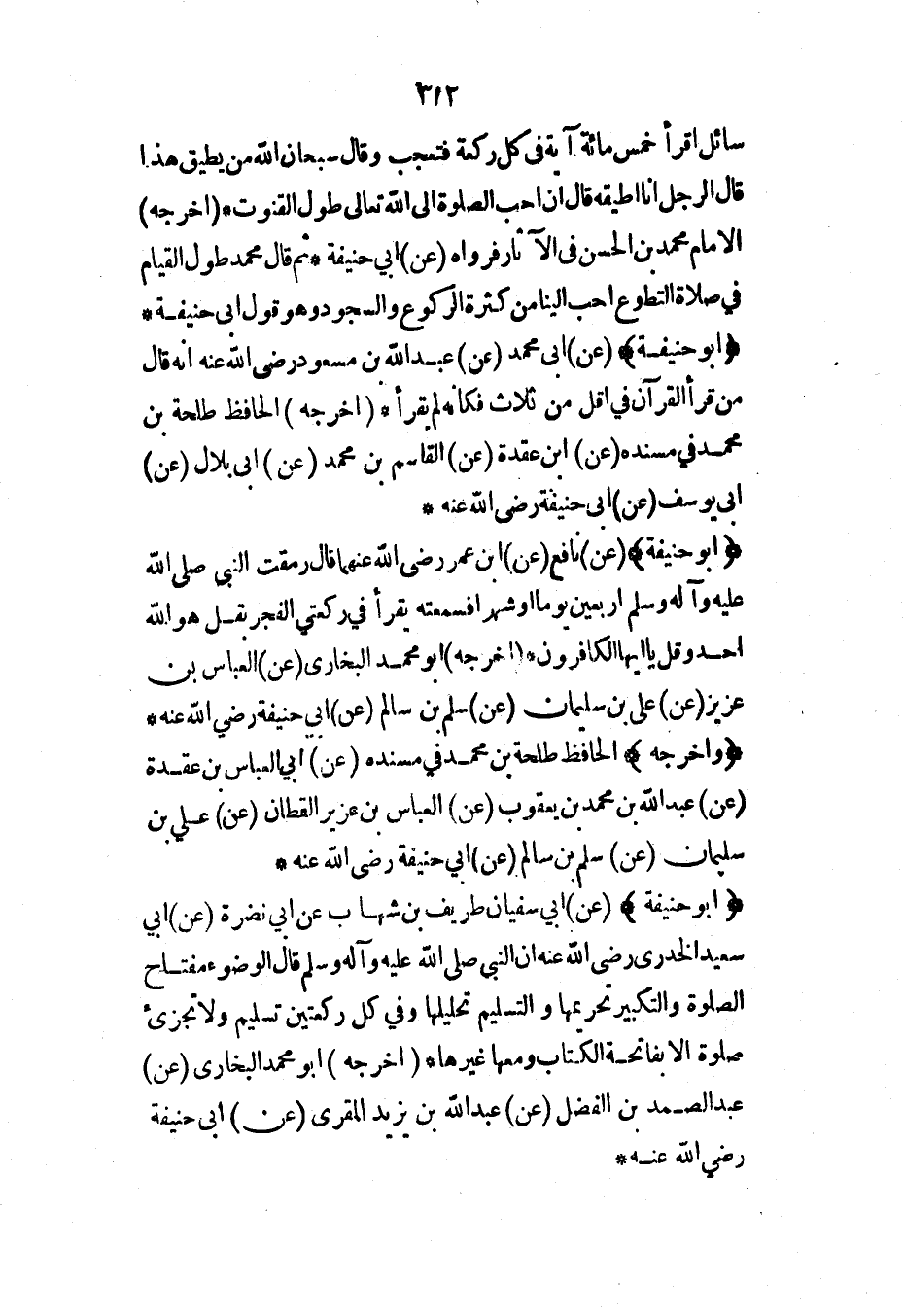 (أبو حنيفة) (عن) نافع (عن) ابن عمر رضي الله عنهما قال رمقت النبي صلى الله عليه وآله وسلم أربعين يوماً أو شهراً فسمعته يقرأ في ركعتي الفجر بقل {هو الله أحد} و {قل يا أيها الكافرون} * (أخرجه) أبو محمد البخاري (عن) العباس بن عزيز (عن) علي بن سليمان (عن) سلم بن سالم (عن) أبي حنيفة رضي الله عنه* (وأخرجه) الحافظ طلحة بن محمد في مسنده (عن) أبي العباس بن عقدة (عن) عبد الله بن محمد بن يعقوب (عن) العباس بن عزير القطان (عن) علي بن سليمان (عن) سلم بن سالم (عن) أبي حنيفة رضي الله عنه*