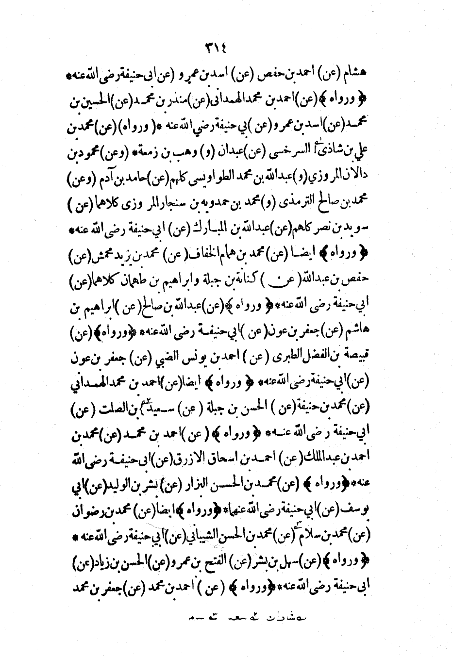 هشام (عن) أحمد بن حفص (عن) أسد بن عمرو (عن) أبي حنيفة رضي الله عنه* (ورواه) (عن) أحمد بن محمد الهمداني (عن) منذر بن محمد (عن) الحسين بن محمد (عن) أسد بن عمرو (عن) أبي حنيفة رضي الله عنه* (ورواه) (عن) محمد بن علي بن شاذي السرخسي (عن) عبدان (و) وهب بن زمعة* (وعن) محمود بن دالان المروزي (و) عبد الله بن محمد الطواويسي كلهم (عن) حامد بن آدم (وعن) محمد بن صالح الترمذي (و) محمد بن حمدويه بن سنجار المروزي كلاهما (عن) سويد بن نصر كلهم (عن) عبد الله بن المبارك (عن) أبي حنيفة رضي الله عنه* (ورواه) أيضاً (عن) محمد بن همام الخفاف (عن) محمد بن يزيد محمش (عن) حفص بن عبد الله (عن) كنانة بن جبلة وإبراهيم بن طهمان كلاهما (عن) أبي حنيفة رضي الله عنه* (ورواه) (عن) عبد الله بن صالح (عن) إبراهيم بن هاشم (عن) جعفر بن عون (عن) أبي حنيفة رضي الله عنه* (ورواه) (عن) قبيصة بن الفضل الطبري (عن) أحمد بن يونس الضبي (عن) جعفر بن عون (عن) أبي حنيفة رضي الله عنه* (ورواه) أيضاً (عن) أحمد بن محمد الهمداني (عن) محمد بن حنيفة (عن) الحسن بن جبلة (عن) سعيد بن الصلت (عن) أبي حنيفة رضي الله عنه* (ورواه) (عن) أحمد بن محمد (عن) محمد بن أحمد بن عبد الملك (عن) أحمد بن إسحاق الأزرق (عن) أبي حنيفة رضي الله عنه* (ورواه) (عن) محمد بن الحسن البزار (عن) بشر بن الوليد (عن) أبي يوسف (عن) أبي حنيفة رضي الله عنهما* (ورواه) أيضاً (عن) محمد بن رضوان (عن) محمد بن سلام (عن) محمد بن الحسن الشيباني (عن) أبي حنيفة رضي الله عنه* (ورواه) (عن) سهل بن بشر (عن) الفتح بن عمرو (عن) الحسن بن زياد (عن) أبي حنيفة رضي الله عنه* (ورواه) (عن) أحمد بن محمد (عن) جعفر بن محمد