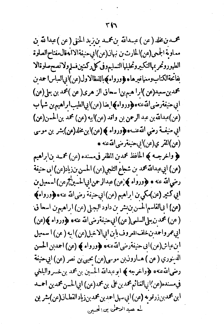 محمد بن مخلد (عن) عبد الله بن محمد بن يزيد الحنفي (عن) عبد الله بن معاوية الجمحي (عن) الحارث بن نبهان (عن) أبي حنيفة إلا أنه قال مفتاح الصلاة الطهور وتحريمها التكبير وتحليلها التسليم وفي كل ركعتين فسلم ولا تصح صلوة إلا بفاتحة الكتاب ومعها غيرها* (ورواه) باللفظ الأول (عن) أبي العباس أحمد بن محمد بن سعيد (عن) إبراهيم بن إسحاق الزهري (عن) محمد بن يعلى (عن) أبي حنيفة رضي الله عنه* (ورواه) أيضاً (عن) أبي الطيب إبراهيم بن شهاب (عن) عبد الله بن عبد الرحمن بن واقد (عن) أبيه (عن) محمد بن الحسن (عن) أبي حنيفة رضي الله عنه* (ورواه) (عن) ابن مخلد (عن) بشر بن موسى (عن) المقري (عن) أبي حنيفة رضي الله عنه*