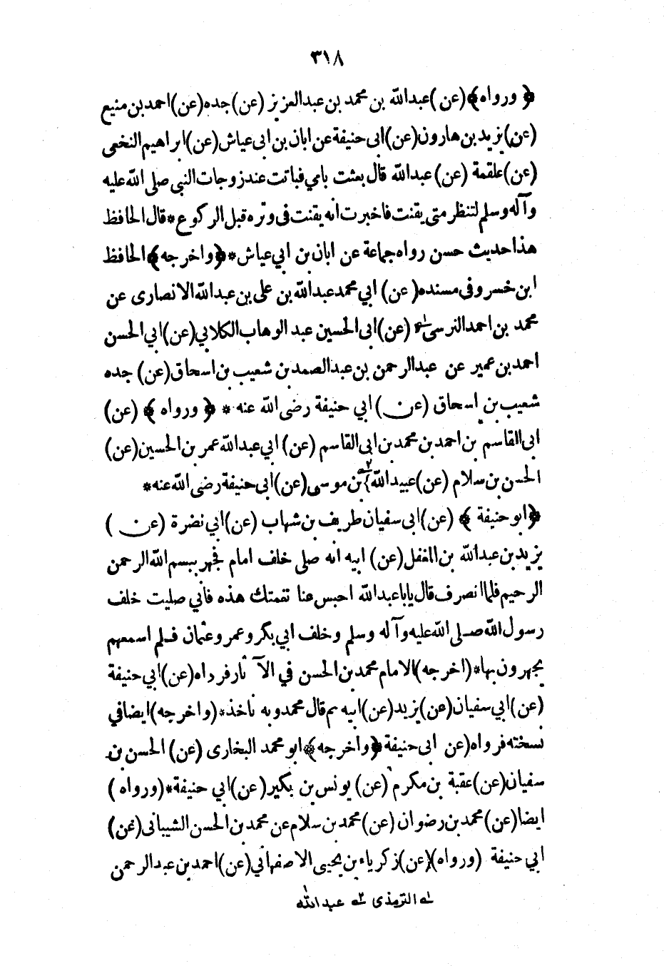 (أبو حنيفة) (عن) أبي سفيان طريف بن شهاب (عن) أبي نضرة (عن) يزيد بن عبد الله بن المغفل (عن) أبيه أنه صلى خلف إمام فجهر ببسم الله الرحمن الرحيم فلما انصرف قال يا عبد الله أحبس عنا نغمتك هذه فإني صليت خلف رسول الله صلى الله عليه وآله وسلم وخلف أبي بكر وعمر وعثمان فلم أسمعهم يجهرون بها* (أخرجه) الإمام محمد بن الحسن في الآثار فرواه (عن) أبي حنيفة (عن) أبي سفيان (عن) يزيد (عن) أبيه ثم قال محمد وبه نأخذ* (وأخرجه) أيضاً في نسخته فرواه (عن) أبي حنيفة (وأخرجه) أبو محمد البخاري (عن) الحسن بن سفيان عن عقبة بن مكرم (عن) يونس بن بكير (عن) أبي حنيفة* (ورواه) أيضاً (عن) محمد بن رضوان (عن) محمد بن سلام عن محمد بن الحسن الشيباني (عن) أبي حنيفة (ورواه) (عن) زكرياء بن يحيى الأصفهاني (عن) أحمد بن عبد الرحمن