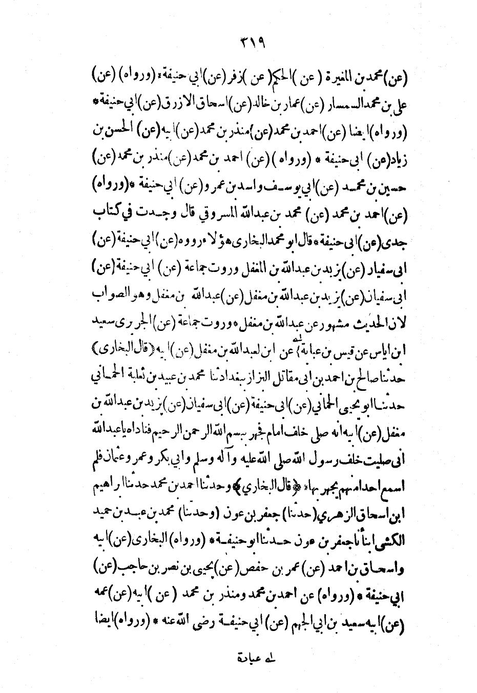 (عن) محمد بن المغيرة (عن) الحكم (عن) زفر (عن) أبي حذيفة (ورواه) (عن) علي بن محمد السمسار (عن) عمار بن خالد (عن) إسحاق الأزرق (عن) أبي حنيفة* (ورواه) أيضاً (عن) أحمد بن محمد (عن) منذر بن محمد (عن) أبيه (عن) الحسن بن زياد (عن) أبي حنيفة* (ورواه) (عن) أحمد بن محمد (عن) منذر بن محمد (عن) حسين بن محمد (عن) أبي يوسف وأسد بن عمرو (عن) أبي حنيفة* (ورواه) (عن) أحمد بن محمد (عن) محمد بن عبد الله المسروقي قال وجدت في كتاب جدي (عن) أبي حنيفة* قال أبو محمد البخاري هؤلاء رووه (عن) أبي حنيفة (عن) أبي سفيان (عن) يزيد بن عبد الله بن المغفل وروت جماعة (عن) أبي حنيفة (عن) أبي سفيان (عن) يزيد بن عبد الله بن مغفل (عن) عبد الله بن مغفل وهو الصواب لأن الحديث مشهور عن عبد الله بن مغفل* وروت جماعة (عن) الجريري سعيد ابن إياس عن قيس بن عباية عن ابن لعبد الله بن مغفل (عن) أبيه (قال البخاري) حدثنا صالح بن أحمد بن أبي مقاتل البزاز ببغداد ثنا محمد بن عبيد بن ثعلبة الحماني حدثنا أبو يحيى الحماني (عن) أبي حنيفة (عن) أبي سفيان (عن) يزيد بن عبد الله بن مغفل (عن) أبيه أنه صلى خلف إمام فجهر ببسم الله الرحمن الرحيم فناداه يا عبد الله إني صليت خلف رسول الله صلى الله عليه وآله وسلم وأبي بكر وعمر وعثمان فلم أسمع أحداً منهم يجهر بها* (قال البخاري) وحدثنا أحمد بن محمد حدثنا إبراهيم ابن إسحاق الزهري (حدثنا) جعفر بن عون (وحدثنا) محمد بن عبد بن حميد الكشي أنبأنا جعفر بن عون حدثنا أبو حنيفة* (ورواه) البخاري (عن) أبيه وإسحاق بن أحمد (عن) عمر بن حفص (عن) يحيى بن نصر بن حاجب (عن) أبي حنيفة* (ورواه) عن أحمد بن محمد ومنذر بن محمد (عن) أبيه (عن) عمه (عن) أبيه سعيد بن أبي الجهم (عن) أبي حنيفة رضي الله عنه* (ورواه) أيضاً