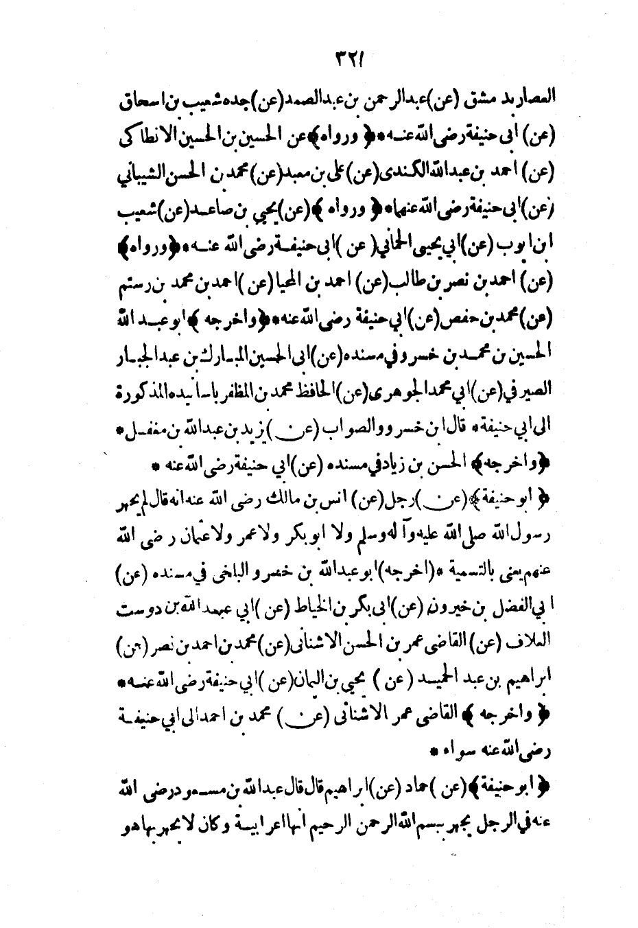 العصار بدمشق (عن) عبد الرحمن بن عبد الصمد (عن) جده شعيب بن إسحاق (عن) أبي حنيفة رضي الله عنه* (ورواه) عن الحسين بن الحسين الأنطاكي (عن) أحمد بن عبد الله الكندي (عن) علي بن معبد (عن) محمد بن الحسن الشيباني (عن) أبي حنيفة رضي الله عنهما* (ورواه) (عن) يحيى بن صاعد (عن) شعيب ابن أيوب (عن) أبي يحيى الحماني (عن) أبي حنيفة رضي الله عنه* (ورواه) (عن) أحمد بن نصر بن طالب (عن) أحمد بن المحيا (عن) أحمد بن محمد بن رستم (عن) محمد بن حفص (عن) أبي حنيفة رضي الله عنه* (وأخرجه) أبو عبد الله الحسين بن محمد بن خسرو في مسنده (عن) أبي الحسين المبارك بن عبد الجبار الصيرفي (عن) أبي محمد الجوهري (عن) الحافظ محمد بن المظفر بأسانيده المذكورة إلى أبي حنيفة* قال ابن خسرو والصواب (عن) يزيد بن عبد الله بن مغفل* (وأخرجه) الحسن بن زياد في مسنده (عن) أبي حنيفة رضي الله عنه*