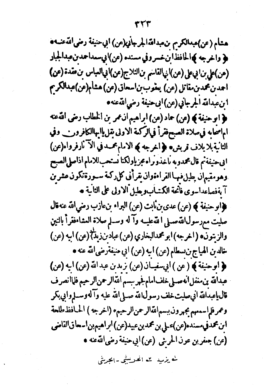 (أبو حنيفة) (عن) عدي بن ثابت (عن) البراء بن عازب رضي الله عنه قال صليت مع رسول الله صلى الله عليه وآله وسلم صلاة العشاء فقرأ بالتين والزيتون* (أخرجه) أبو محمد البخاري (عن) عباد بن زيد (عن) أبيه (عن) خالد بن الهياج بن بسطام (عن) أبيه (عن) أبي حنيفة رضي الله عنه*