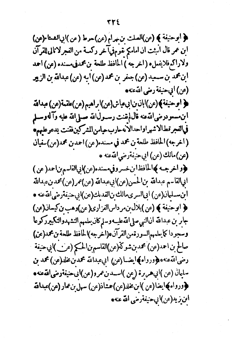 (أبو حنيفة) (عن) الصلت بن بهرام (عن) حوط (عن) أبي الشعثاء (عن) ابن عمر قال أنبئت أن إمامكم يقوم في آخر ركعة من الفجر لا تالي للقرآن ولا راكع فلا يفعل* (أخرجه) الحافظ طلحة بن محمد في مسنده (عن) أحمد ابن محمد بن سعيد (عن) جعفر بن محمد (عن) أبيه (عن) عبد الله بن الزبير (عن) أبي حنيفة رضي الله عنه*